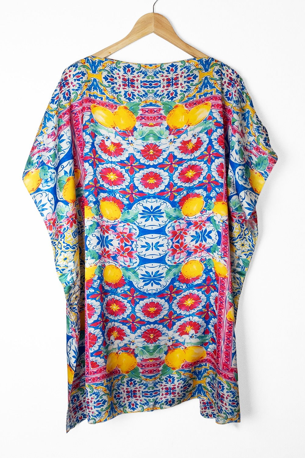 Shopika Rochie de plaja tip poncho din matase cu imprimeu mediteranean cu lamai pe alb si fucsia