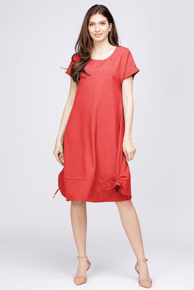 Rochie uni `A line` din in mercerizat corai, cu sireturi laterale