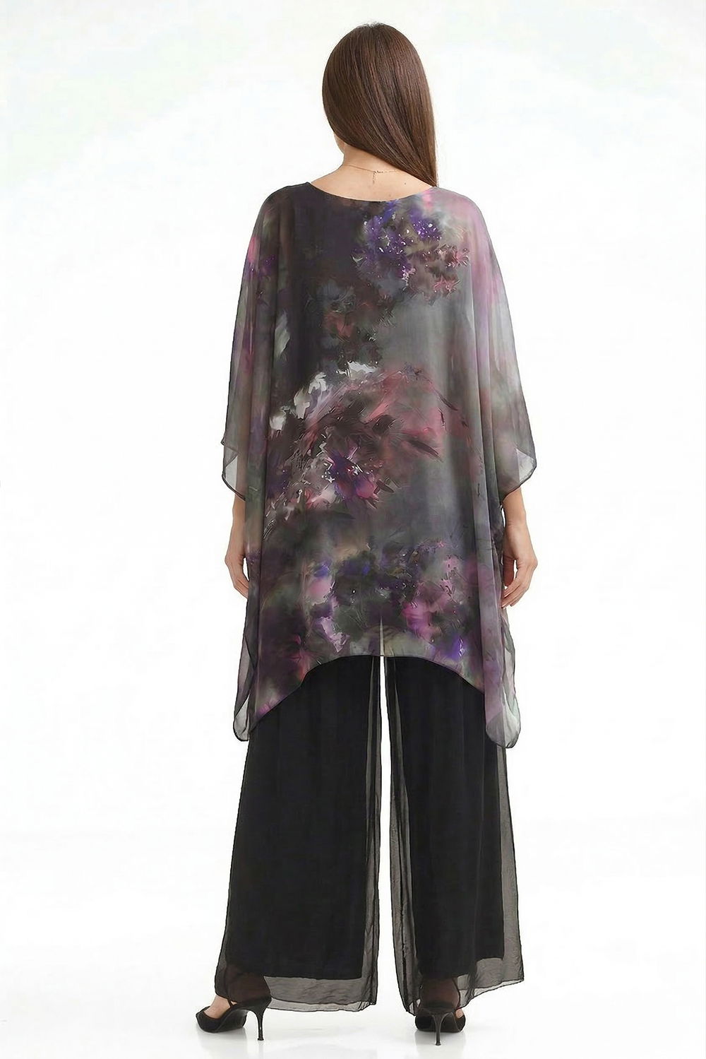 Bluza tunica din matase si vascoza in colturi cu imprimeu pictural in nuante de mov, negru si gri