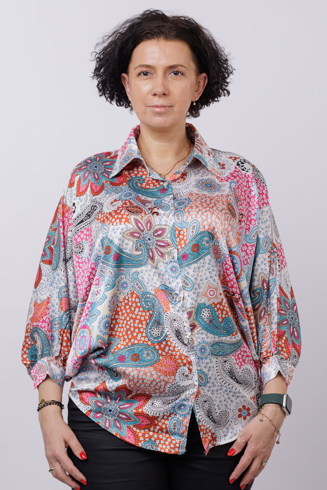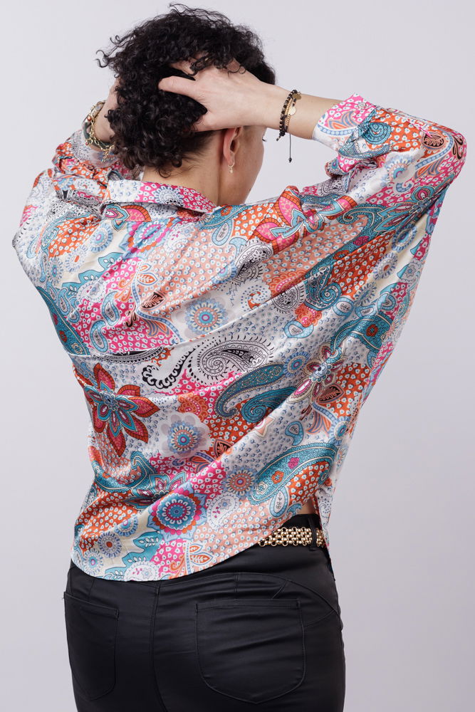 Camasa din satin imprimat este lejera si ofera comoditate si lejeritate in miscare.