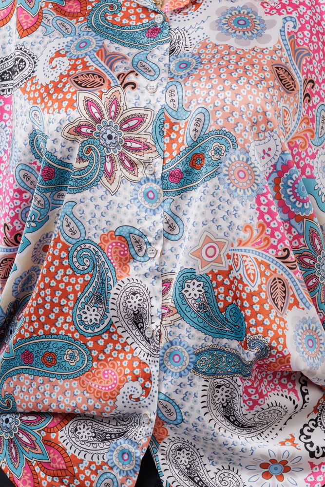 Camasa oversize, cu maneci bufante si imprimeu arabesc cu nuante de bleu si fucsia