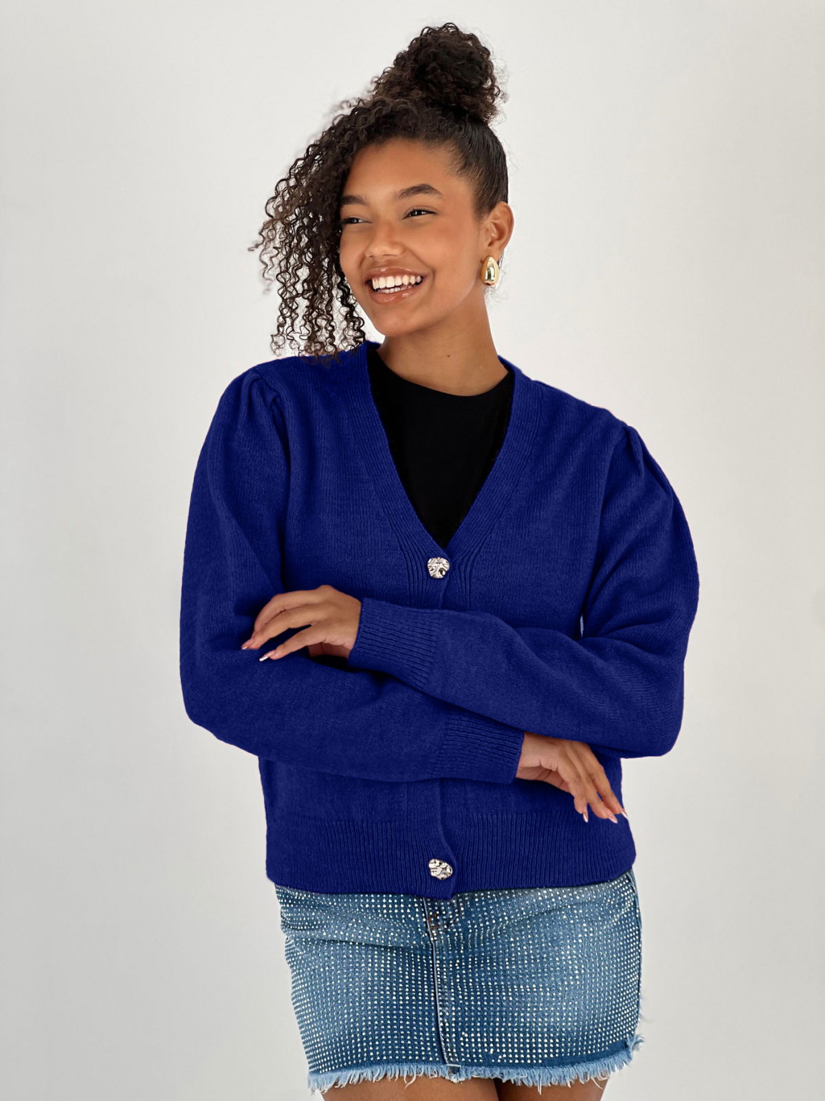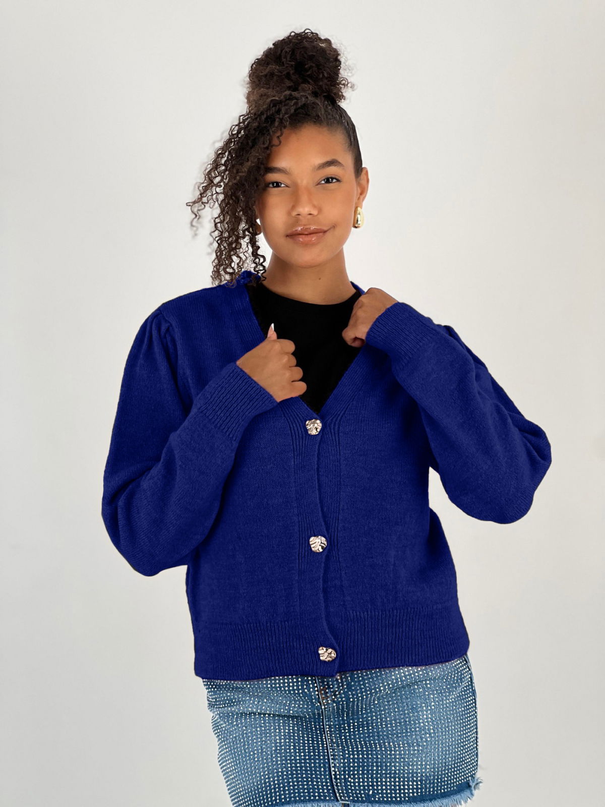 Miss Poem Cardigan cu decolteu in V, din tricotaj albastru cu nasturi decorativi aurii