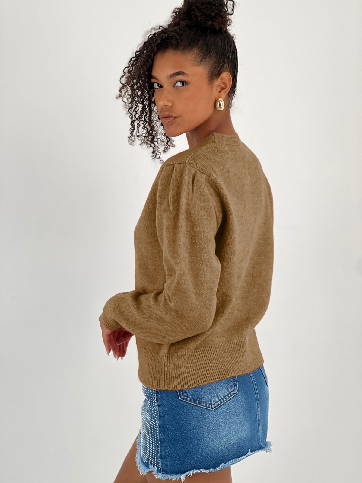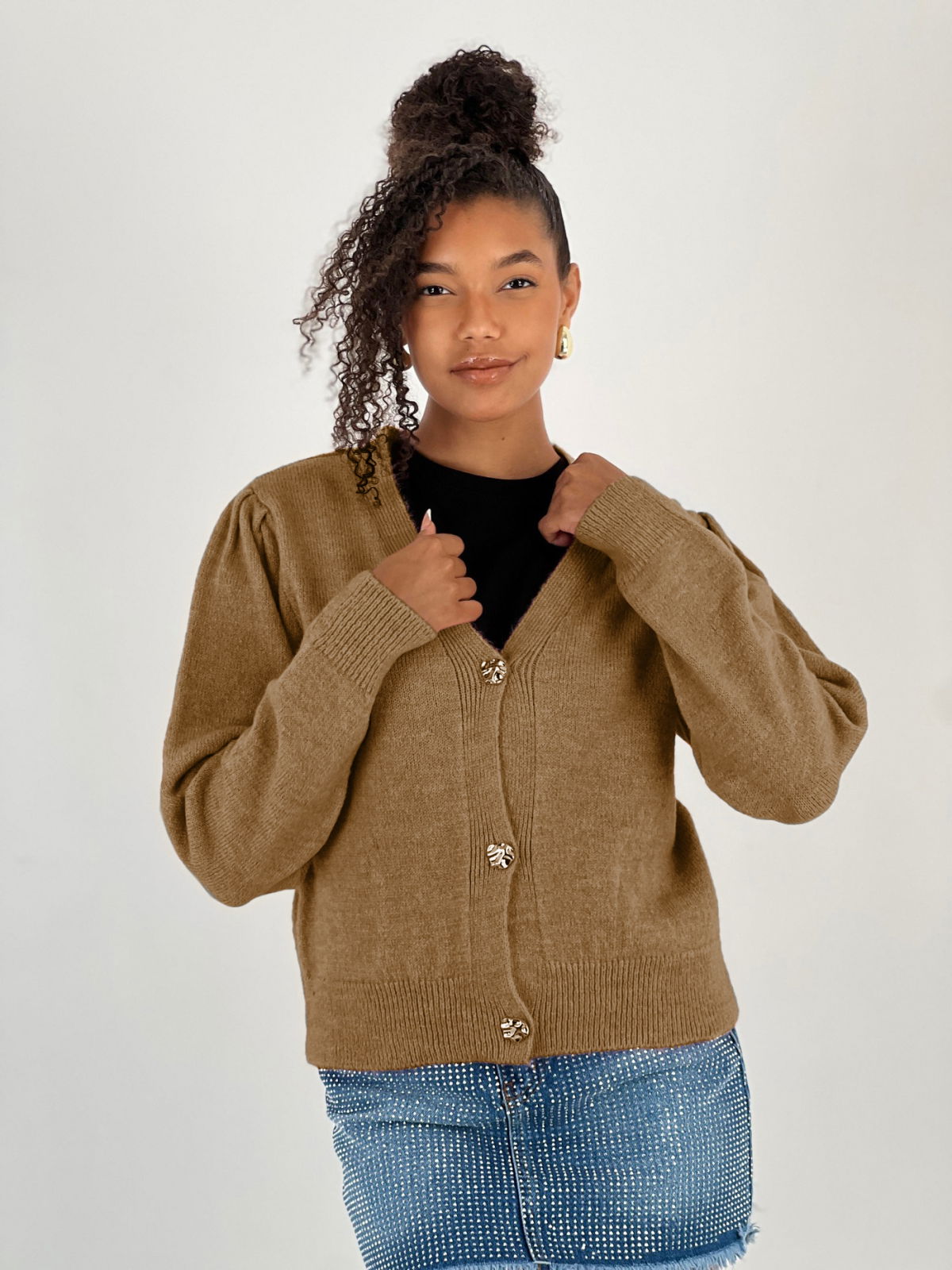Miss Poem Cardigan cu decolteu in V, din tricotaj camel cu nasturi decorativi aurii