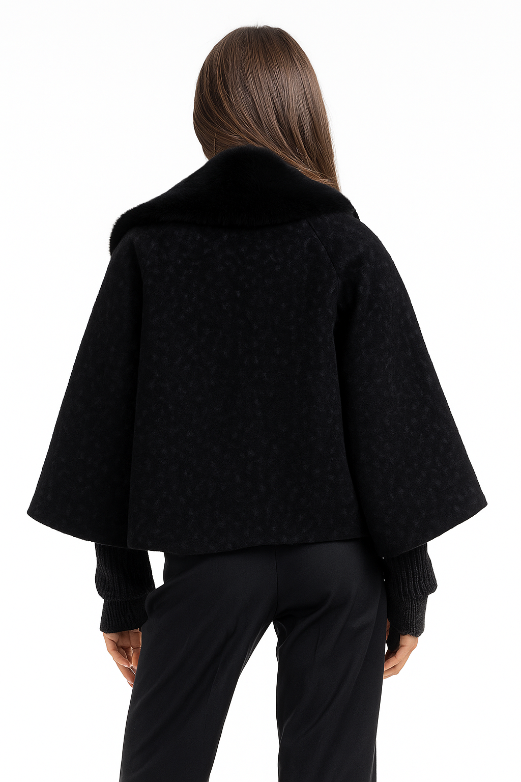 Croiala scurtă și lejeră pune în evidență silueta, iar gulerul din blăniță adaugă un detaliu rafinat, potrivit pentru ținute de zi sau de seară. Se închide frontal cu nasturi, fiind ușor de purtat peste rochii, pantaloni eleganți sau jeansi.
