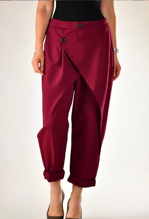 O piesa statement, conceputa pentru femeia care apreciaza designul neconventional si eleganta discreta. Pantalonii impresioneaza prin panoul frontal suprapus, fixat cu nasturi decorativi, care creeaza o arhitectura moderna si un efect vizual sofisticat. Croiala lejera, cu volum controlat si mansete rasucite, aduce un aer effortless chic, iar talia structurata pune subtil in valoare silueta. Materialul cu tinuta frumoasa confera miscare fluida si confort pe tot parcursul zilei. O alegere premium, versatila, care transforma instant orice tinuta intr-una memorabila.