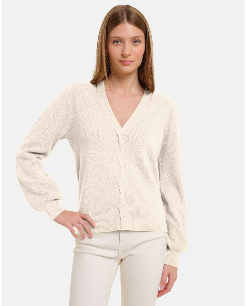 Shopika Pulover cu impletitura decorativa si decolteu in V, alb