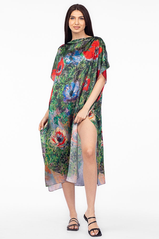 Shopika Rochie de plaja lunga tip poncho din matase cu imprimeu impresionist, floral pe fond verde