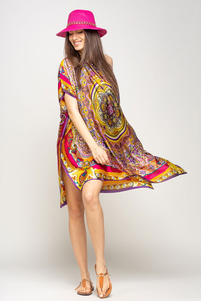 Shopika Rochie de plaja tip poncho din matase cu mandala centrala in chenar fucsia si mov