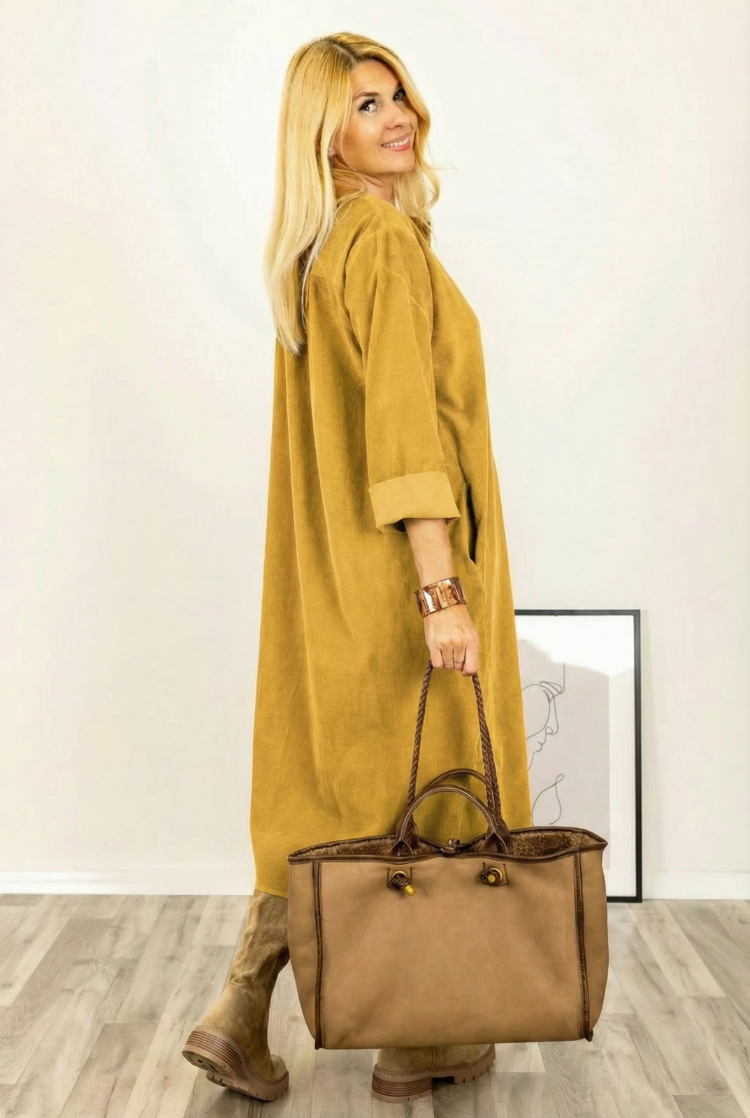 Shopika Rochie din catifea reiata, cu nasturi mari de lemn pe piept, galben mustar