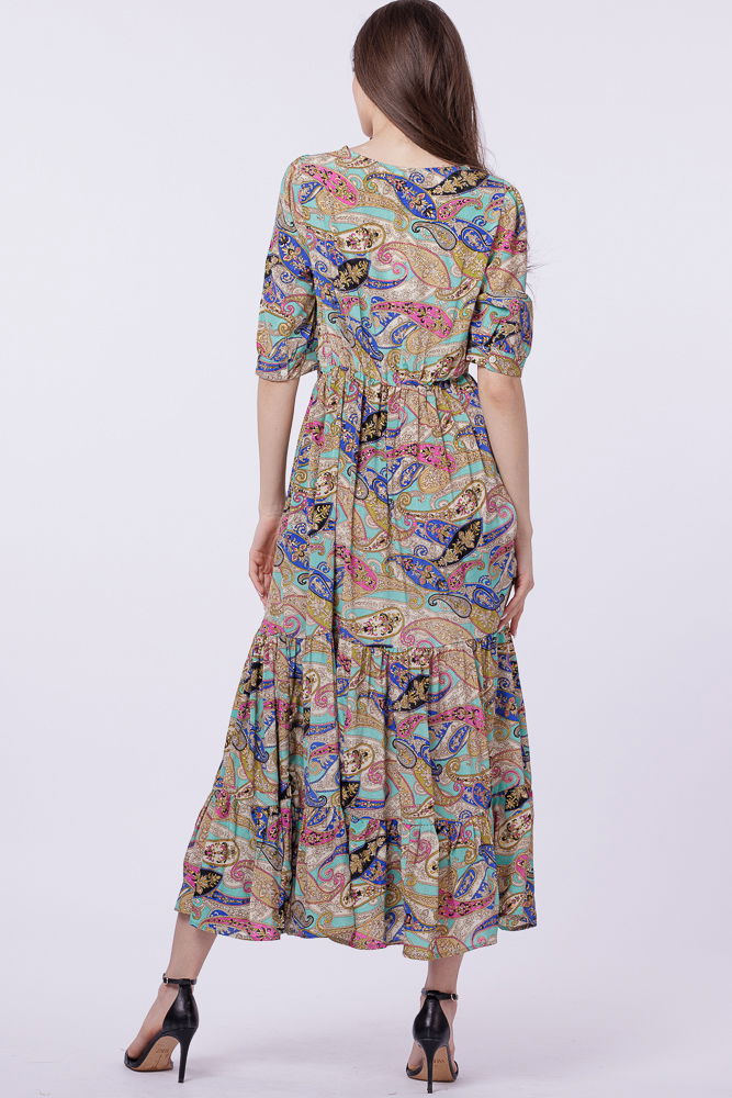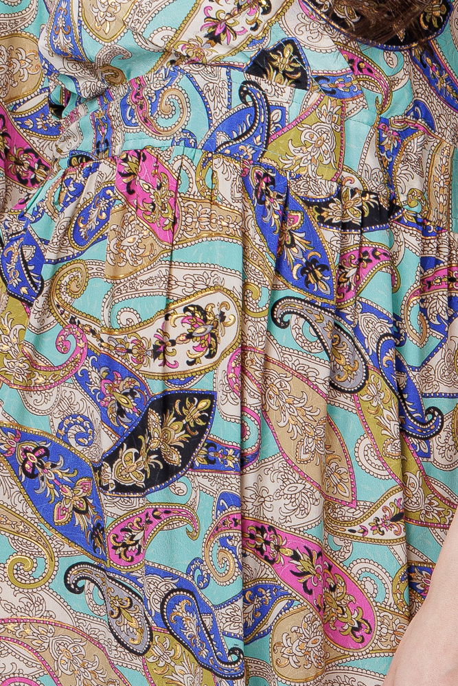 Rochie lunga din matase indiana, cu bust petrecut, imprimeu paisley si elemente aurii