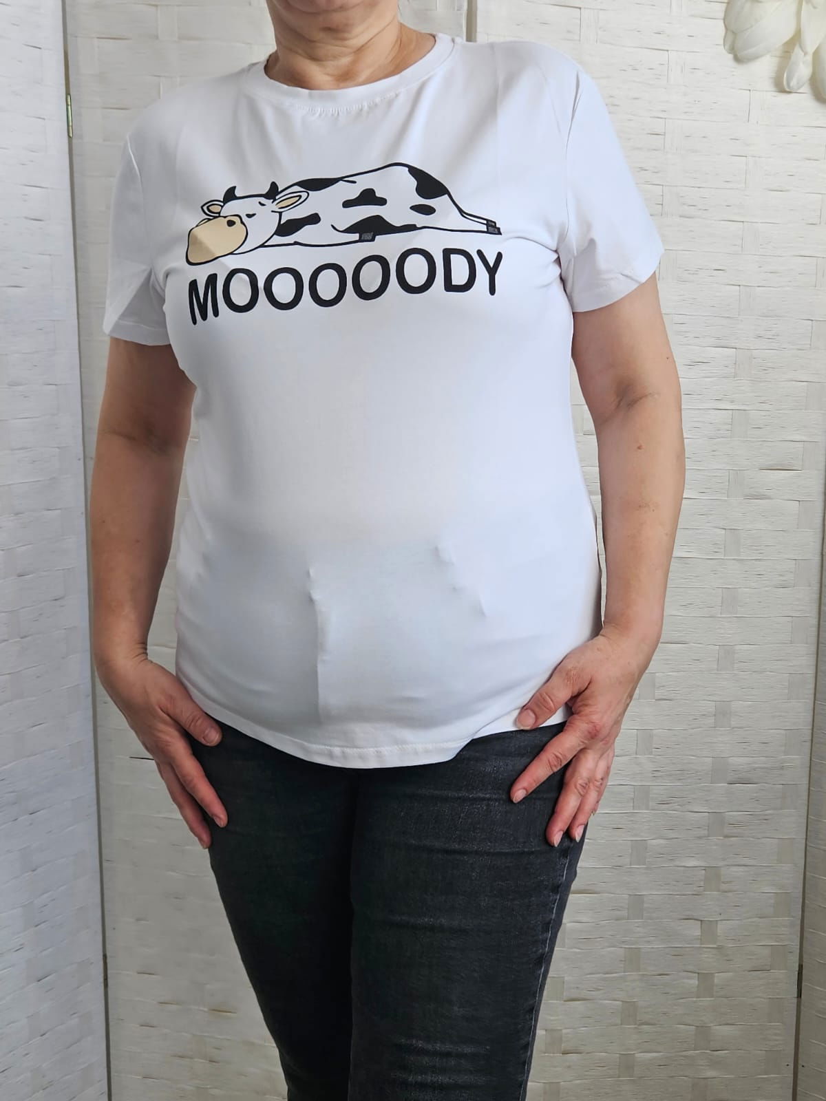 Tricou alb confecționat din bumbac moale, ideal pentru un plus de confort și lejeritate. Modelul este decorat cu un imprimeu simpatic care adaugă un aer jucăuș și original. Croiala este adaptată pentru mărimi mari, oferind libertate de mișcare și o potrivire relaxată. Perfect pentru ținute casual, acest tricou aduce un strop de veselie în garderoba de zi cu zi.