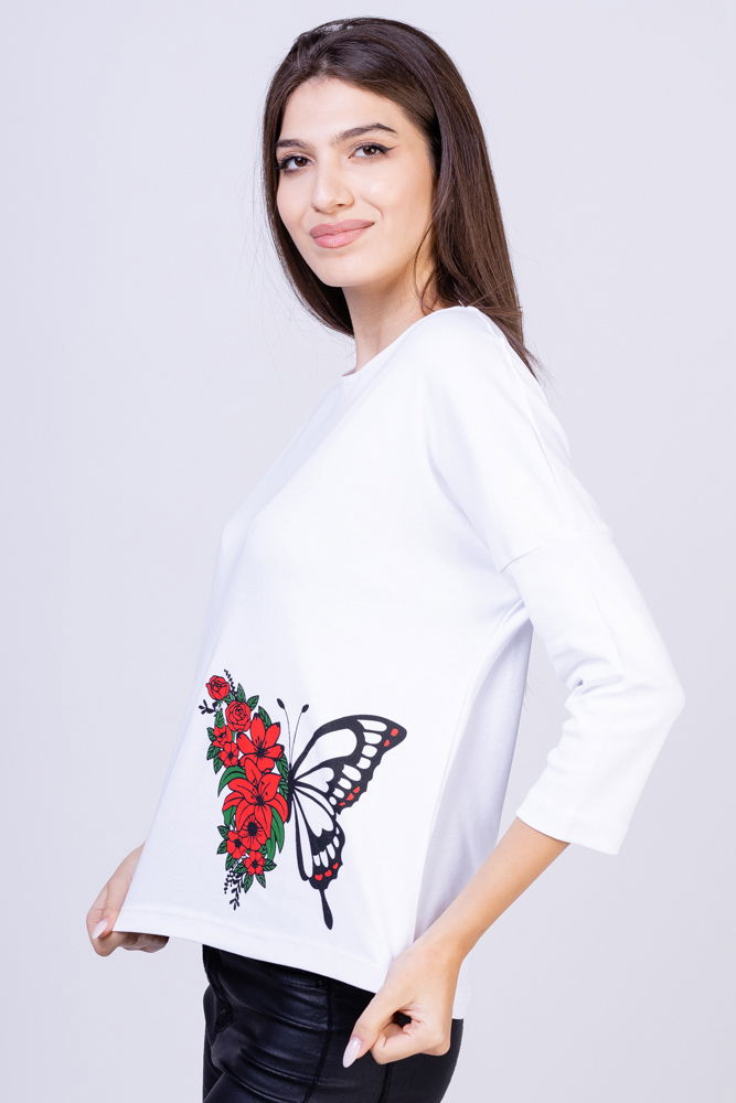 Pierino Tricou alb din bumbac, cu maneci 3/4 si imprimeu fluture