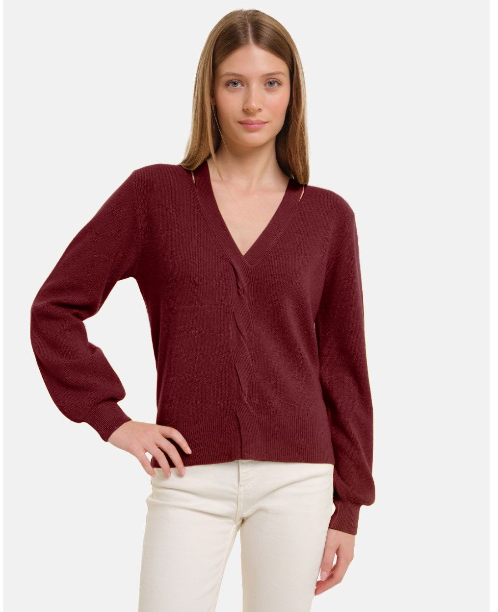 Shopika Pulover cu impletitura decorativa si decolteu in V, bordo