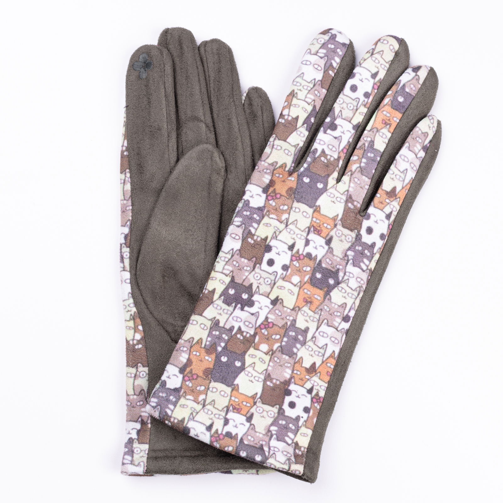 Manusi dama imprimeu pisici cu ochi mari pe fond kaki, material catifelat