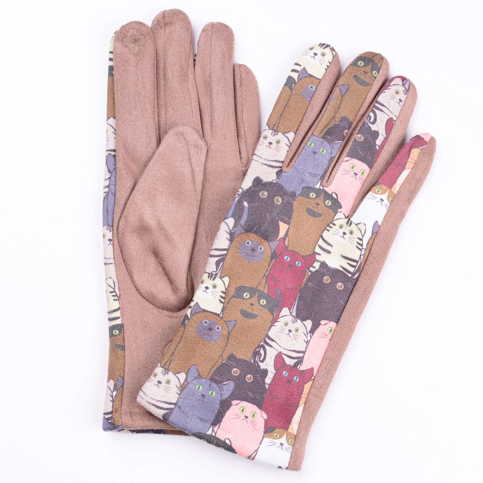 Manusi dama imprimeu pisici grasute pe fond bej inchis, material catifelat