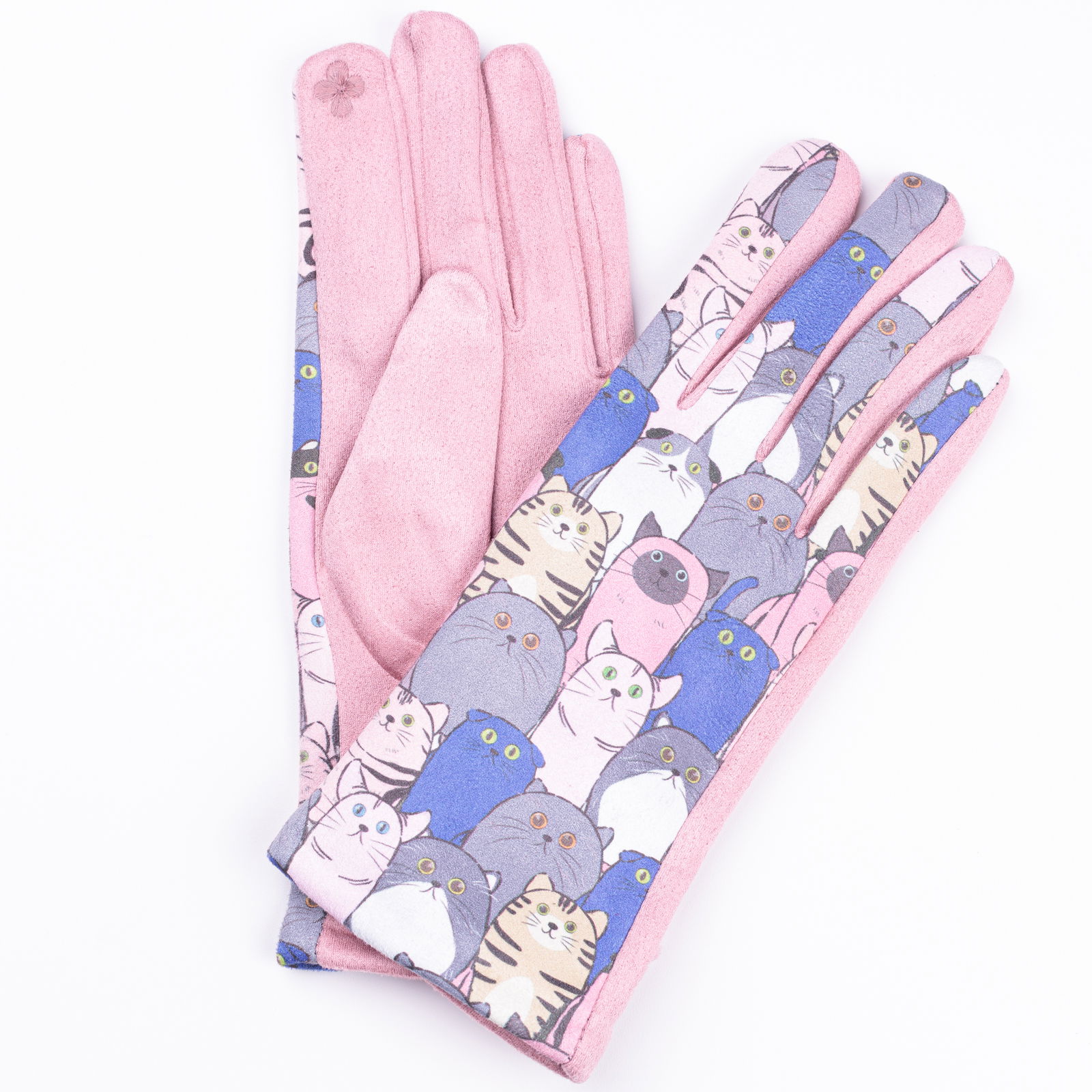 Manusi dama imprimeu pisici grasute pe fond roz prafuit, material catifelat