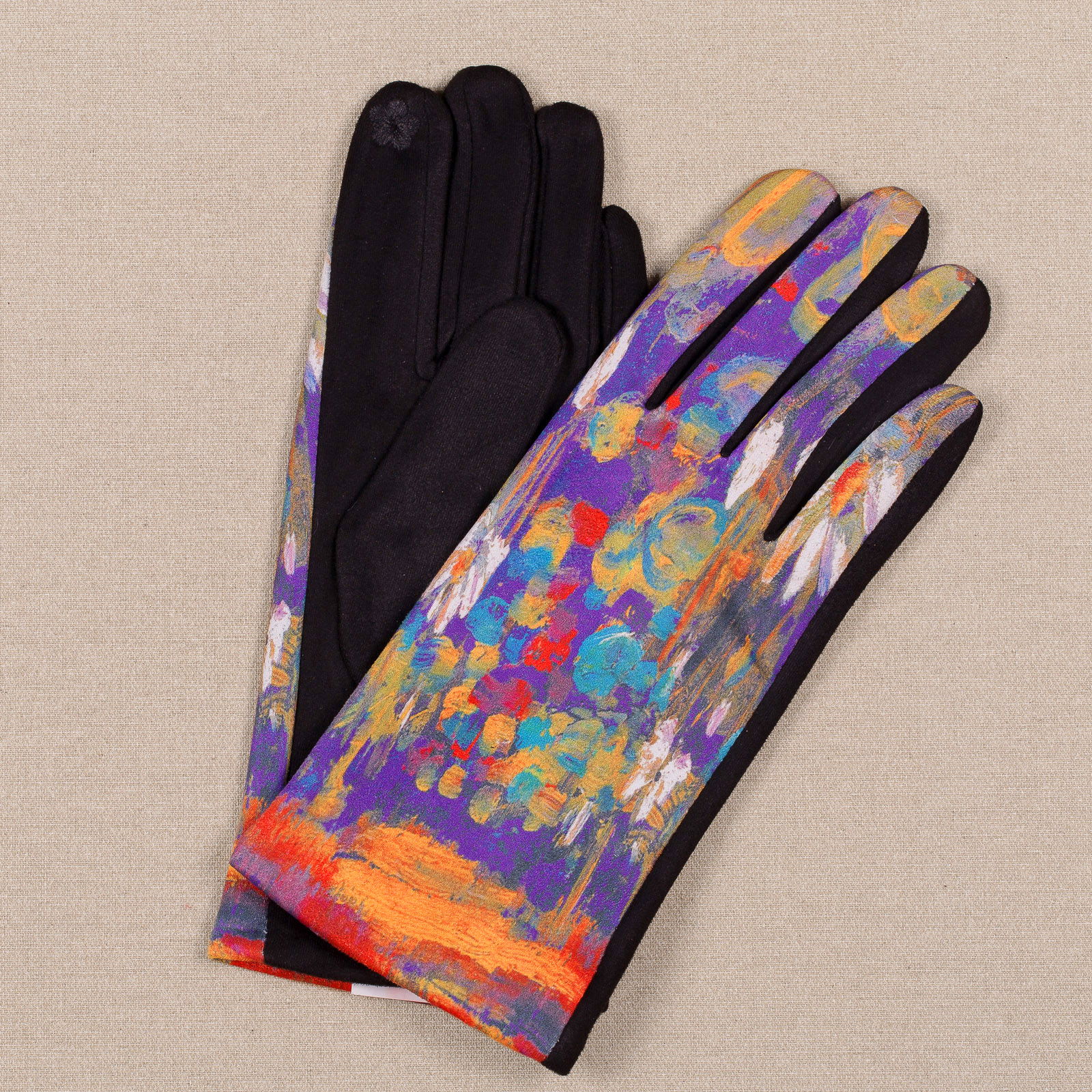 Perechea de manusi are fata imprimata cu o pictura inspirata arta moderna, iar palma este confectionata dintr-un textil negru, elastic, captusit la interior cu o blanita fina.