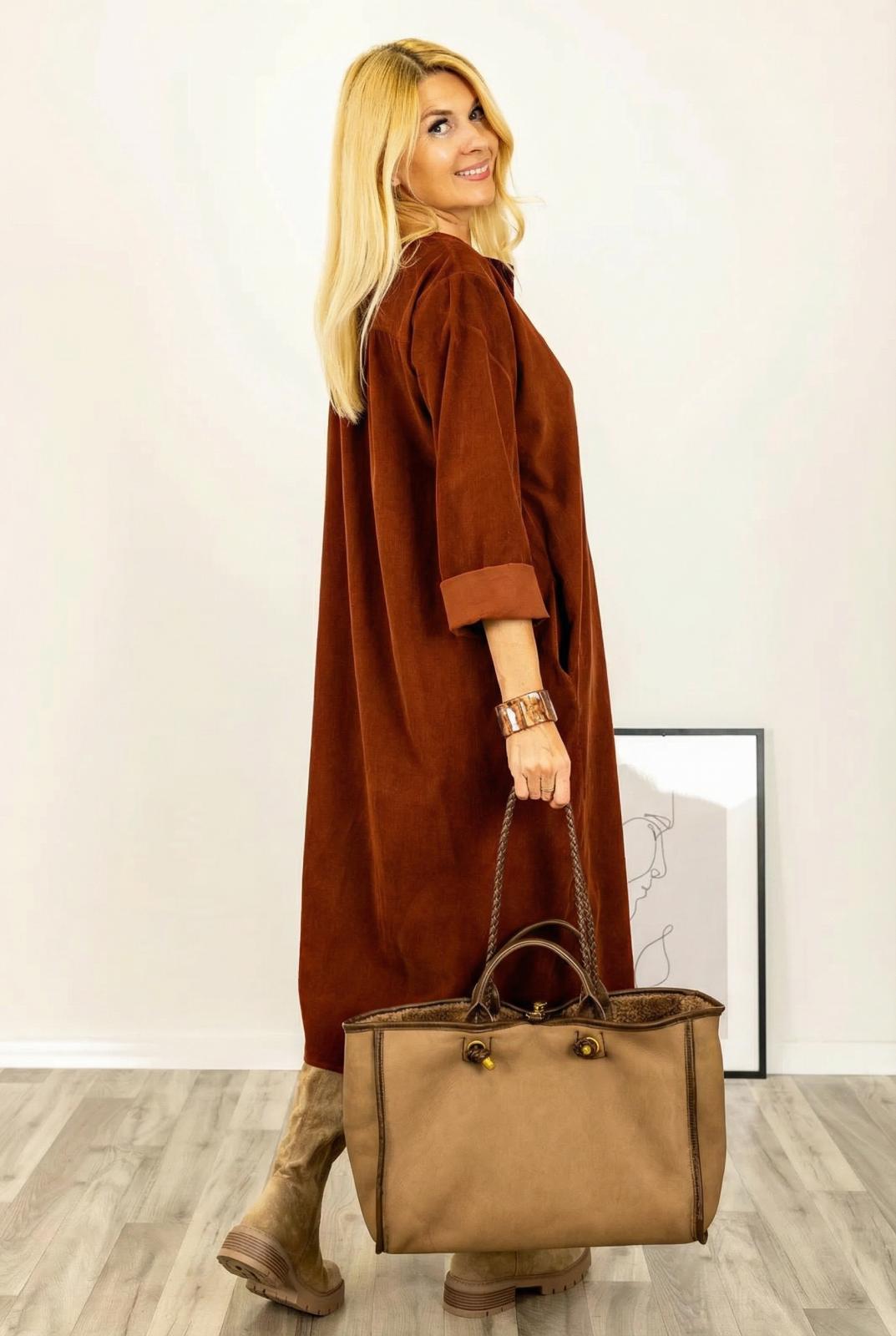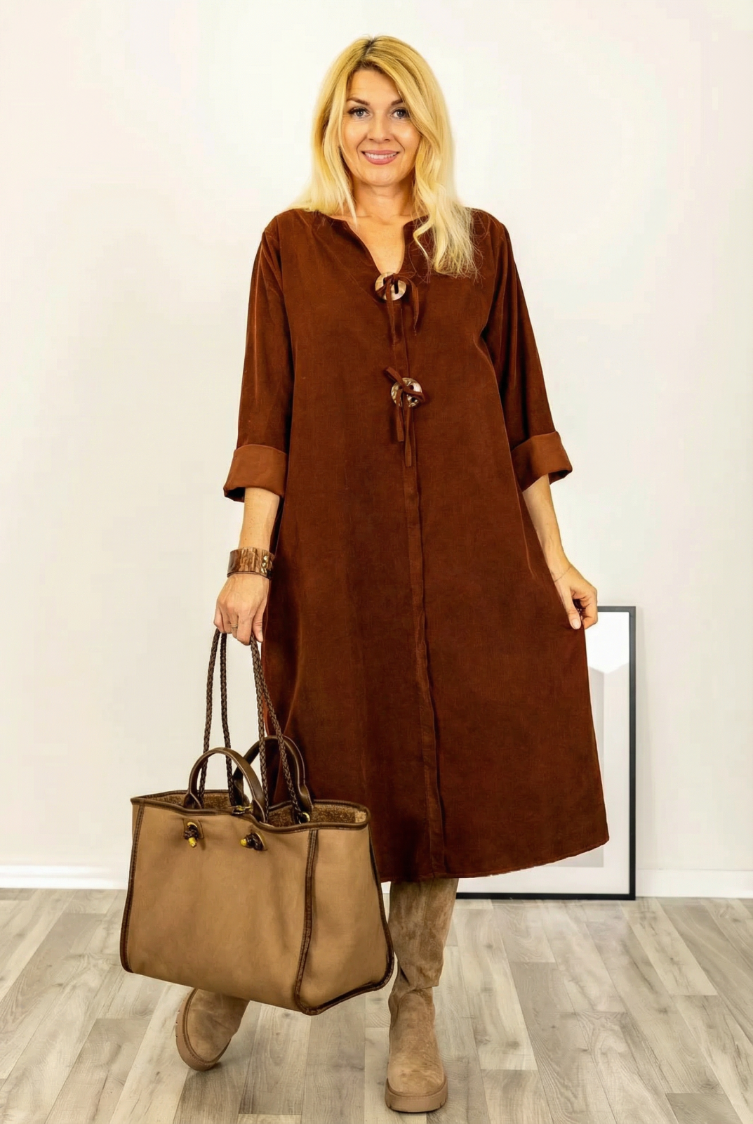 Shopika Rochie din catifea reiata, cu nasturi mari de lemn pe piept, coniac