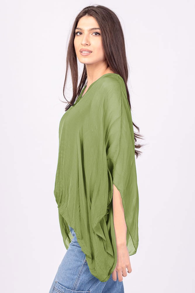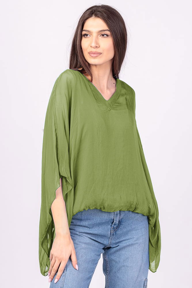 Shopika Bluza din matase si vascoza verde oliv, cu decolteu in V in fata si pe spate