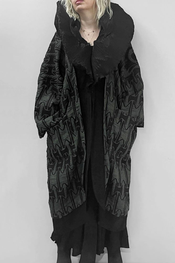Jacheta neagra oversized redefineste eleganta moderna printr-o croiala spectaculoasa si un joc de texturi in relief. Gulerul amplu, moale si structurat, adauga volum si un aer sofisticat, in timp ce liniile asimetrice si designul artistic creeaza o silueta fluida, usor dramatica. Materialul bogat, cu model abstract, se aseaza frumos pe corp si se combina perfect cu tinute monocrome, rochii simple sau cizme inalte pentru un look urban premium. O piesa statement, versatila, ideala pentru sezonul rece si pentru garderobele care cauta stil si personalitate.