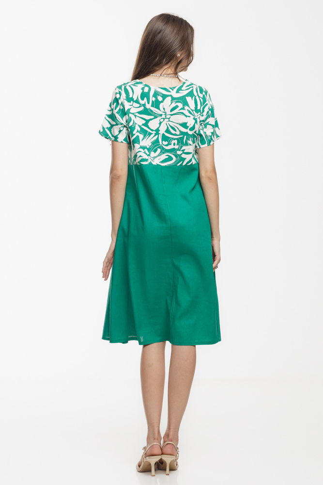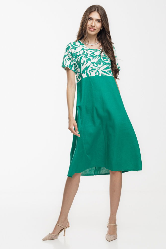 Rochie de vara realizata din in mercerizat, un material cu textura neteda, croita lejer pentru confort si miscare. Croiala feminina, cu maneci scurte si decolteu rotund, potrivita pentru tinute casual chic, zile calduroase sau vacante. Materialul din in mercerizat asigura respirabilitate si un plus de eleganta naturala. Rochia de tip `A line` este foarte apreciata deoarece avantajeaza orice silueta si este foarte comoda si confortabila.