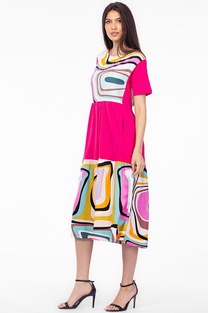 Rochia formata dintr-o combinatie de material uni (tricot) si material cu un imprimeu este ideala pentru o tinuta de efect numai buna de purtat in perioada calda a anului.