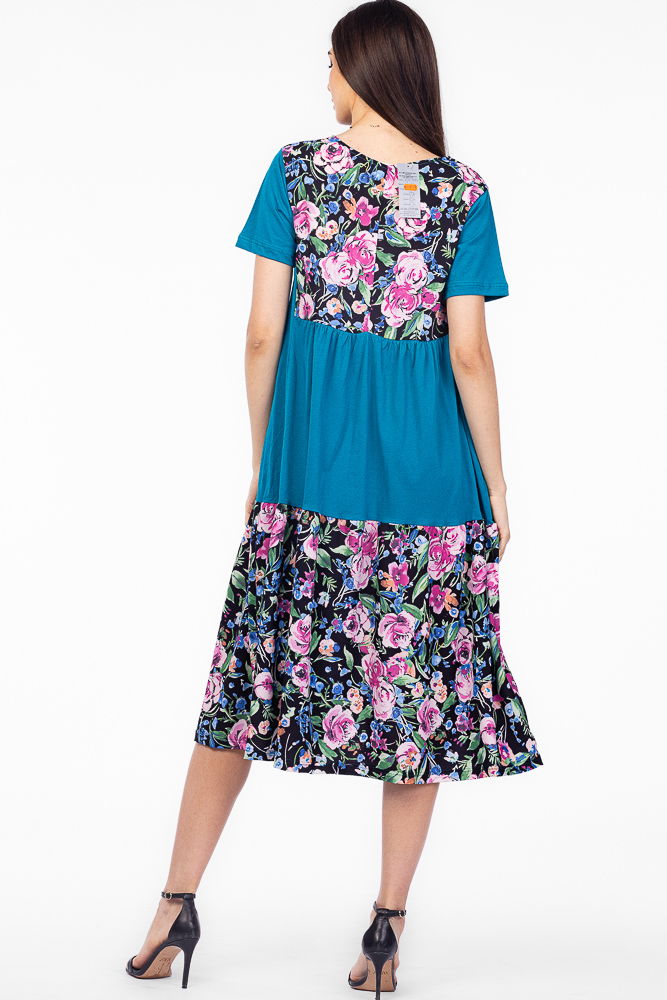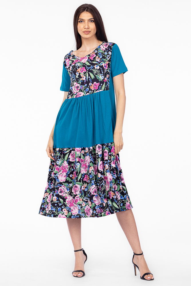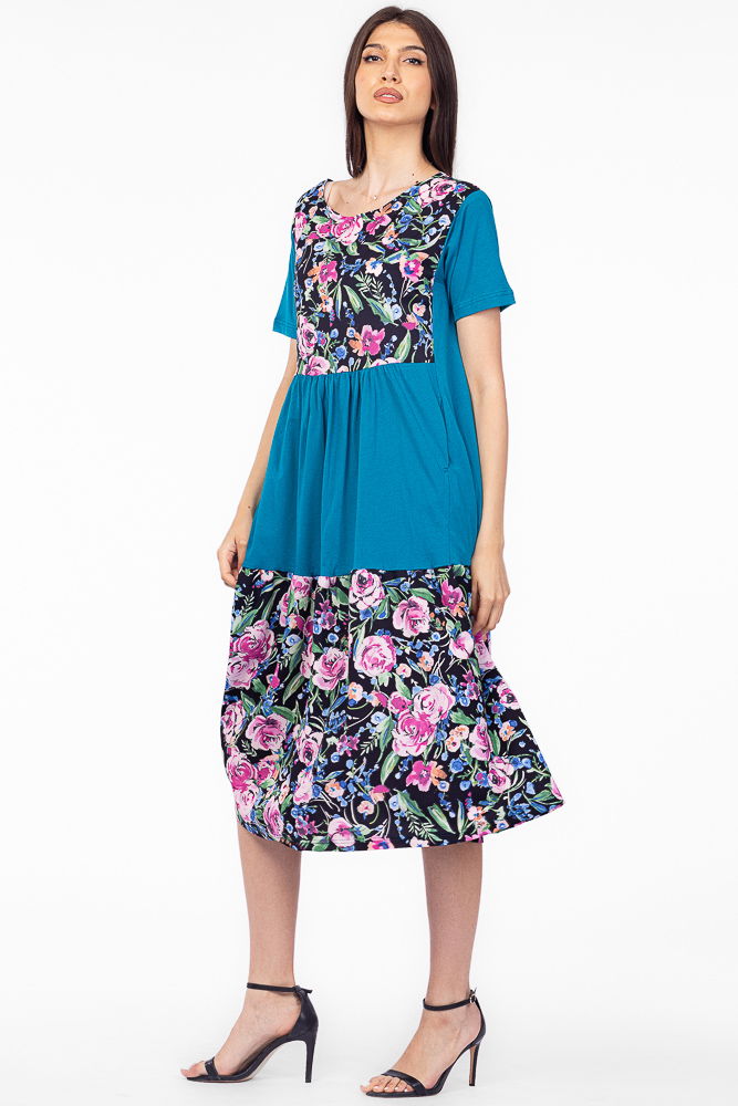 Pierino Rochie turcoaz cu platca si doua volane, imprimeu trandafiri, din bumbac