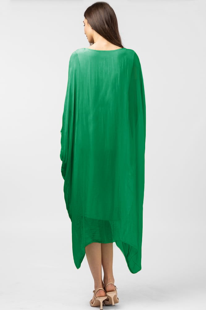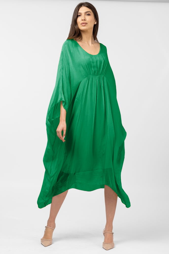 Shopika Rochie verde in colturi, lunga, ampla, din matase si vascoza, cu detaliu sub bust