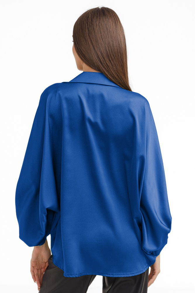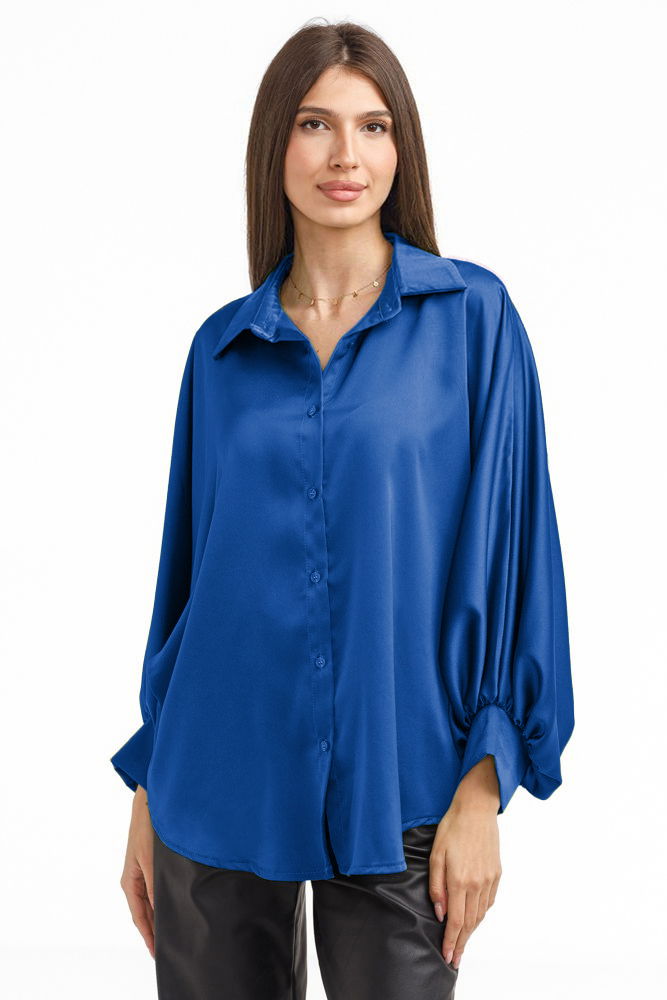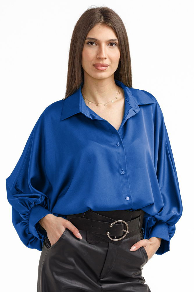 Shopika Camasa eleganta din satin, cu maneci bufante, albastra
