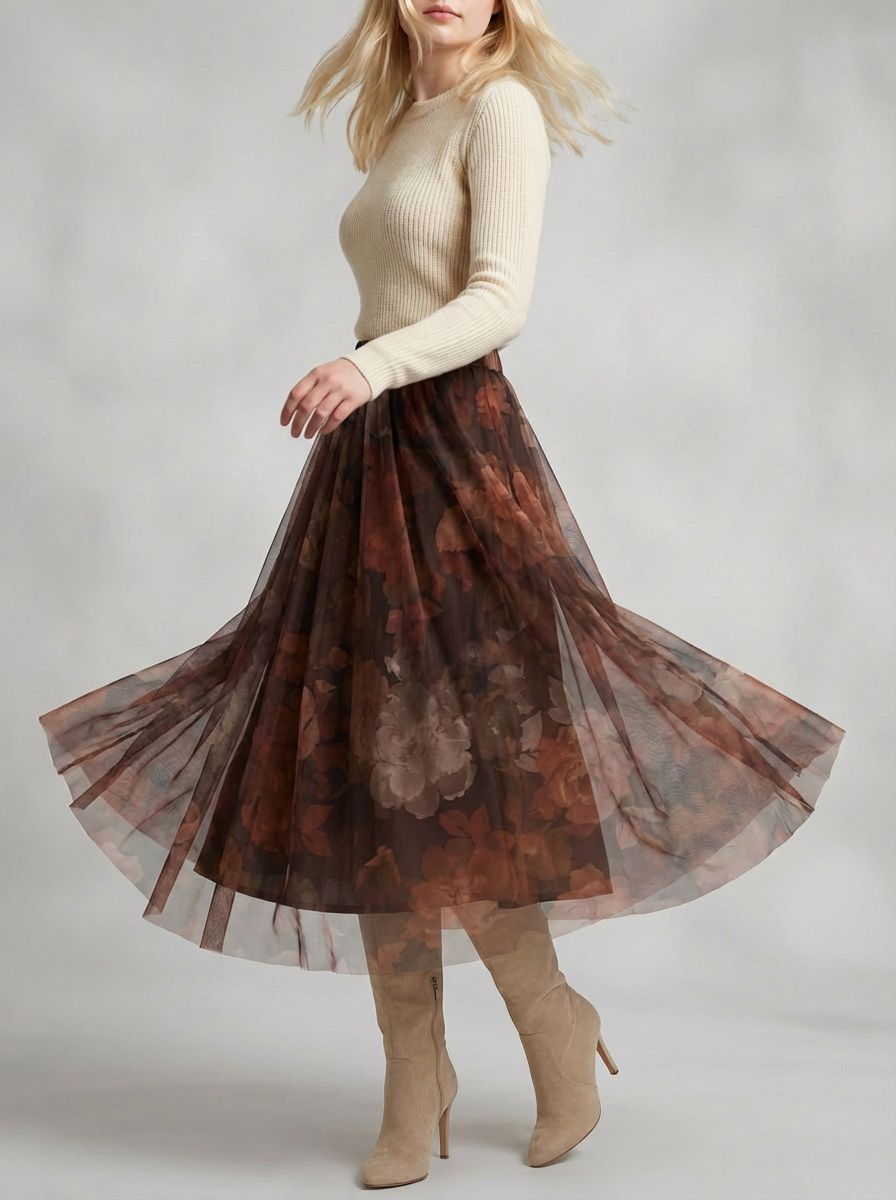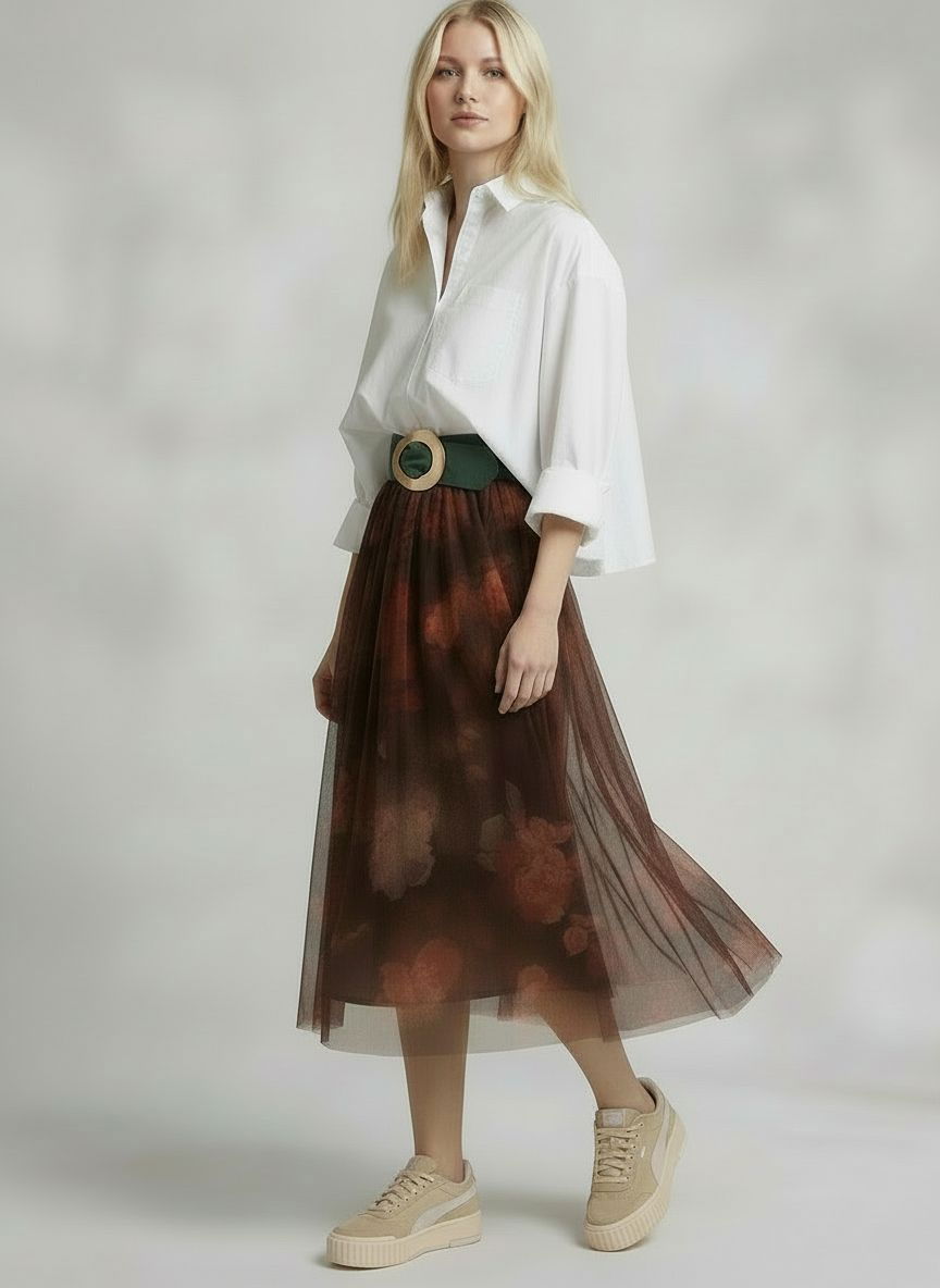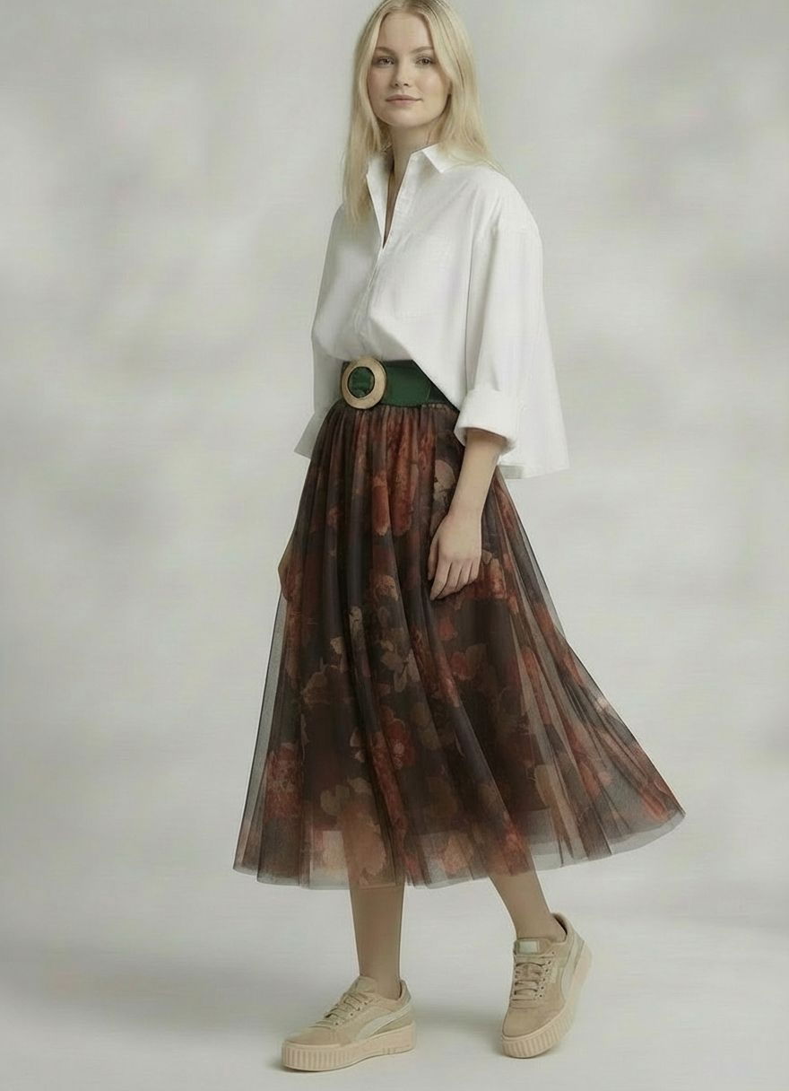 Shopika Fusta clos din tulle cu imprimeu floral in nuante de maro