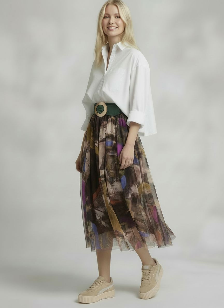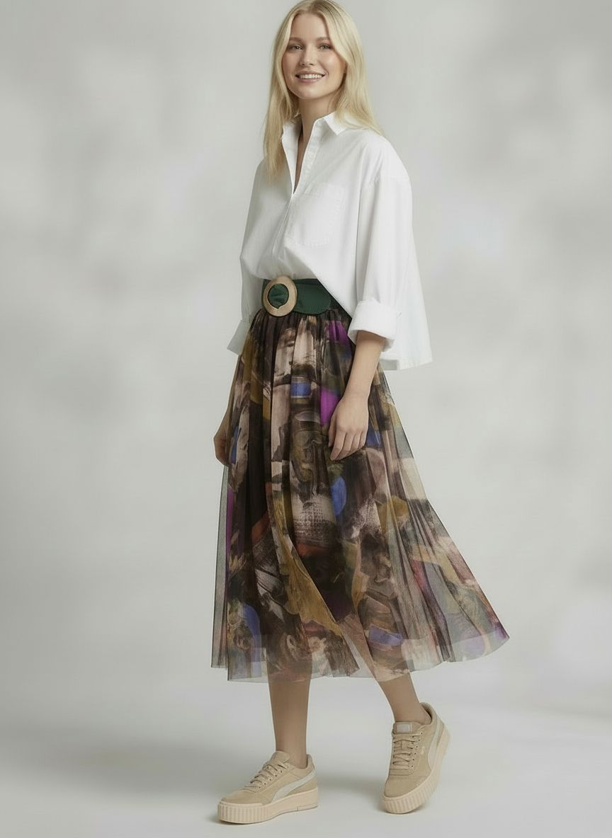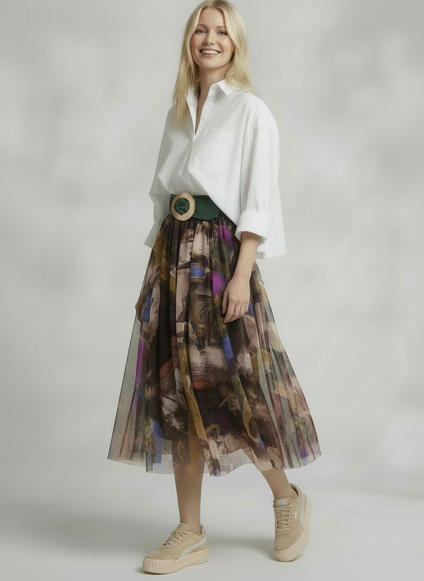 Shopika Fusta clos din tulle cu imprimeu pictural cu maro, bej, mov si albastru