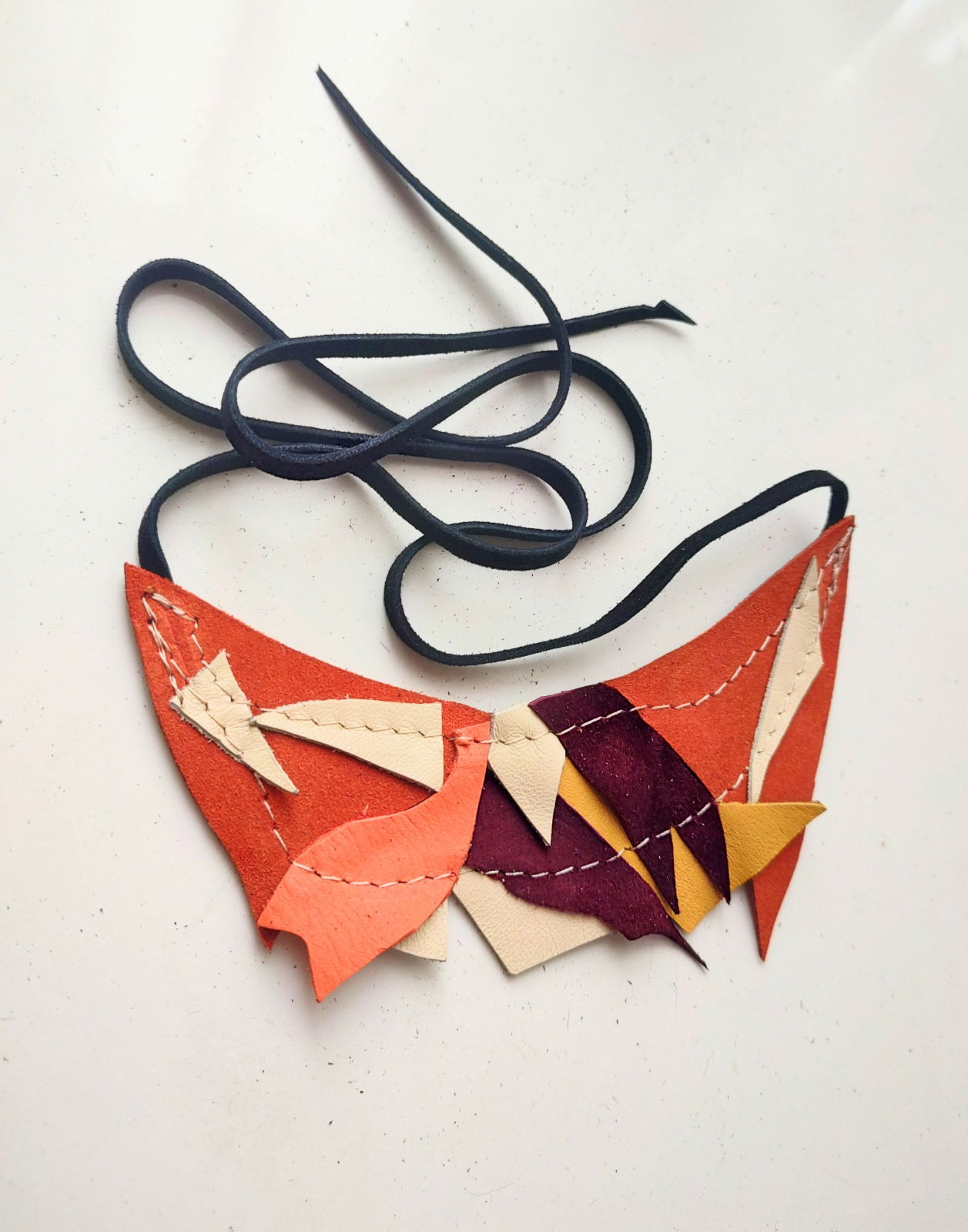 Acest colier asimetric și  unicat ,din piele naturală, a fost creat spre a fi purtat de o persoană îndrăzneață, care își dorește să iasă din anonimat .