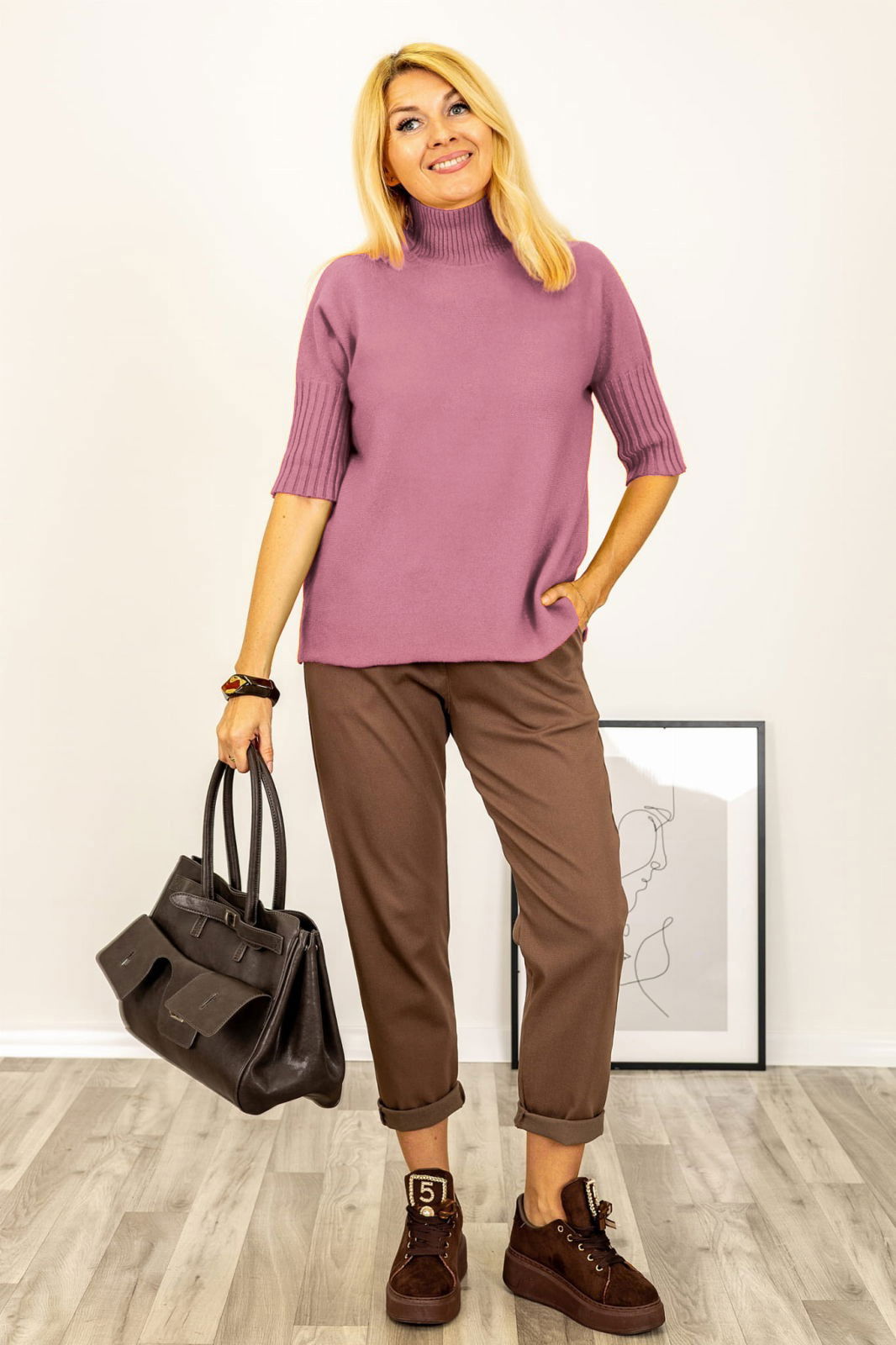 Pulover lejer cu guler inalt si maneci scurte tip ribbed, ideal pentru tinute casual-chic de toamna si iarna. Materialul moale ofera confort, iar croiala versatila se asorteaza usor cu pantaloni largi, jeansi sau fuste. O piesa moderna si feminina, potrivita pentru look-uri de zi cu un strop de eleganta.