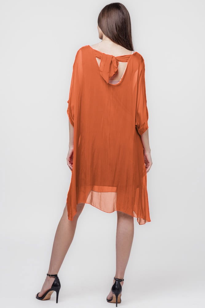 Shopika Rochie midi, dreapta, din matase si vascoza, cu funda pe spate, caramizie