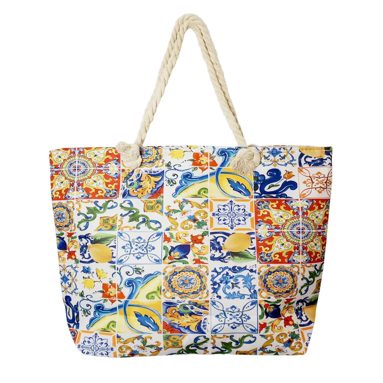 Geanta de plaja din material textil, cu imprimeu model marocan cu lamai in culori vibrante