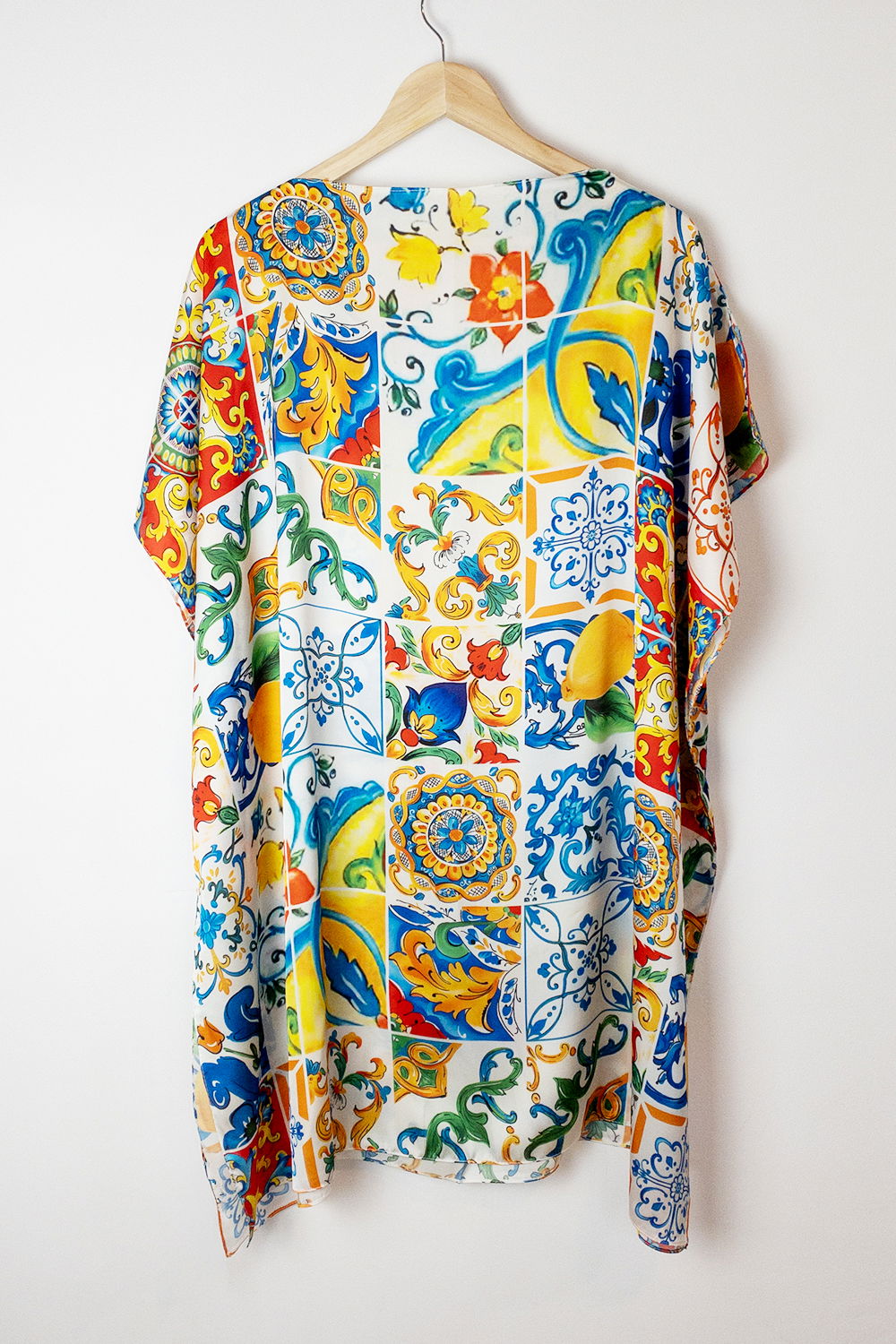 Rochie de plaja tip poncho din matase cu imprimeu model marocan cu lamai in culori vibrante