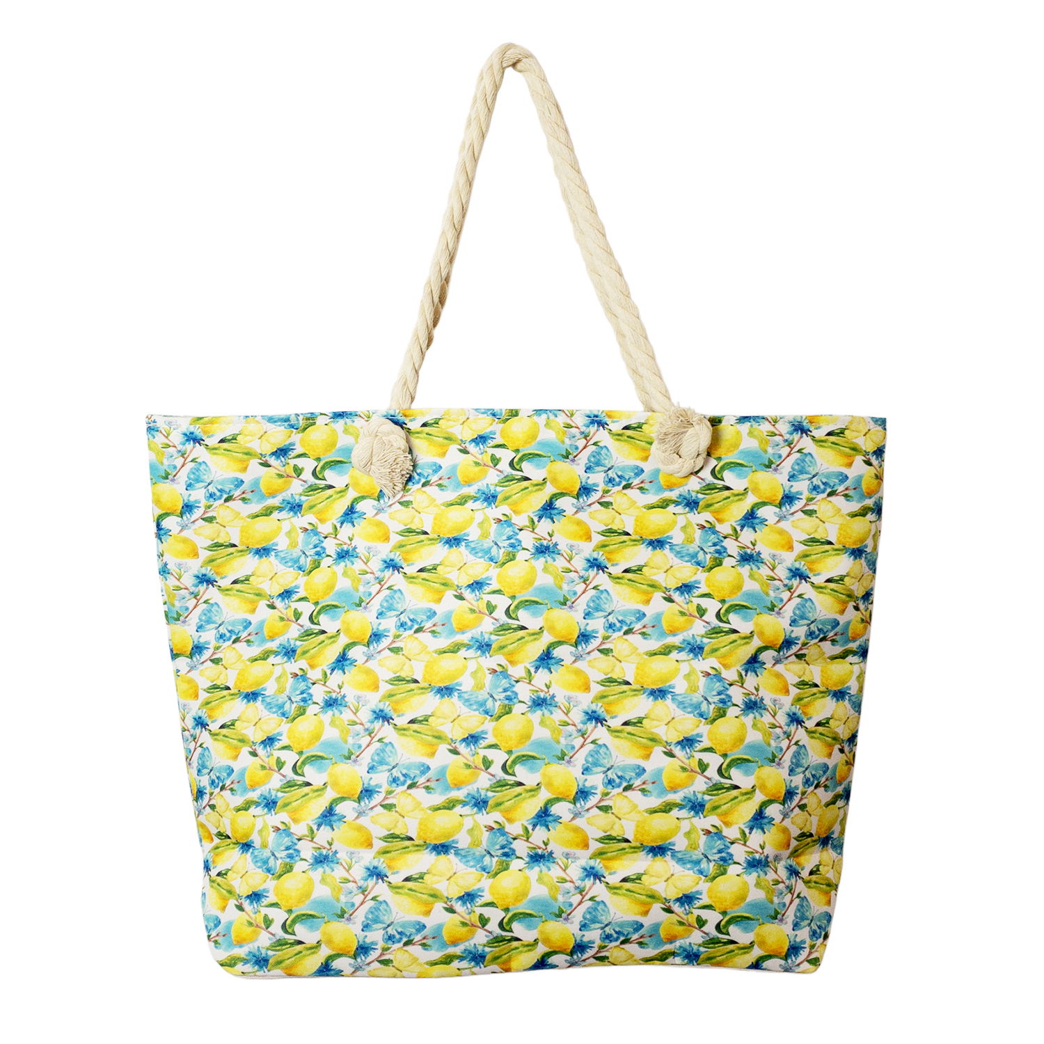 Geanta de plaja din material textil, cu model mediteranean cu lamai si fluturi