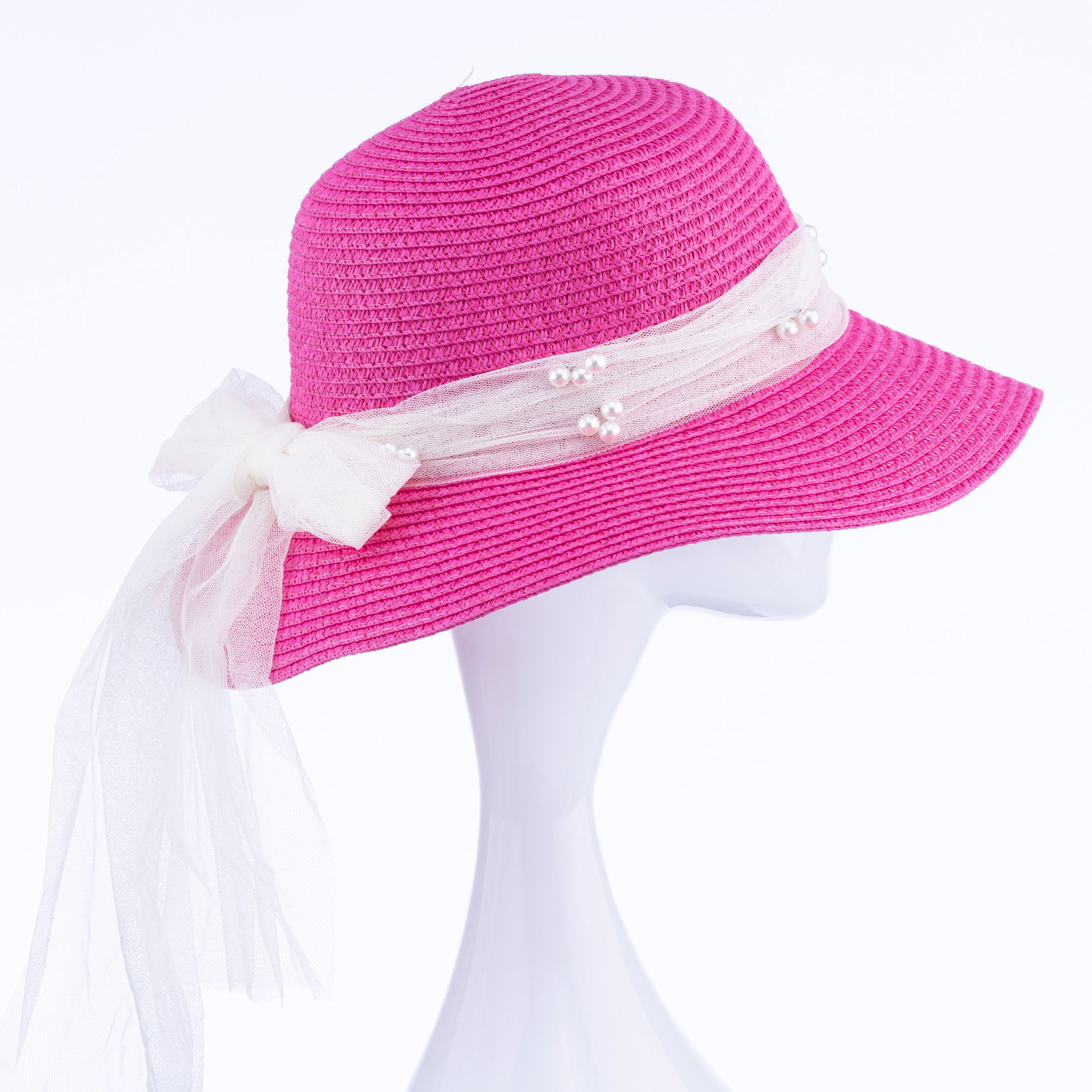 Shopika Palarie de paie impletita cu decoratiune funda cu perle fine, fucsia