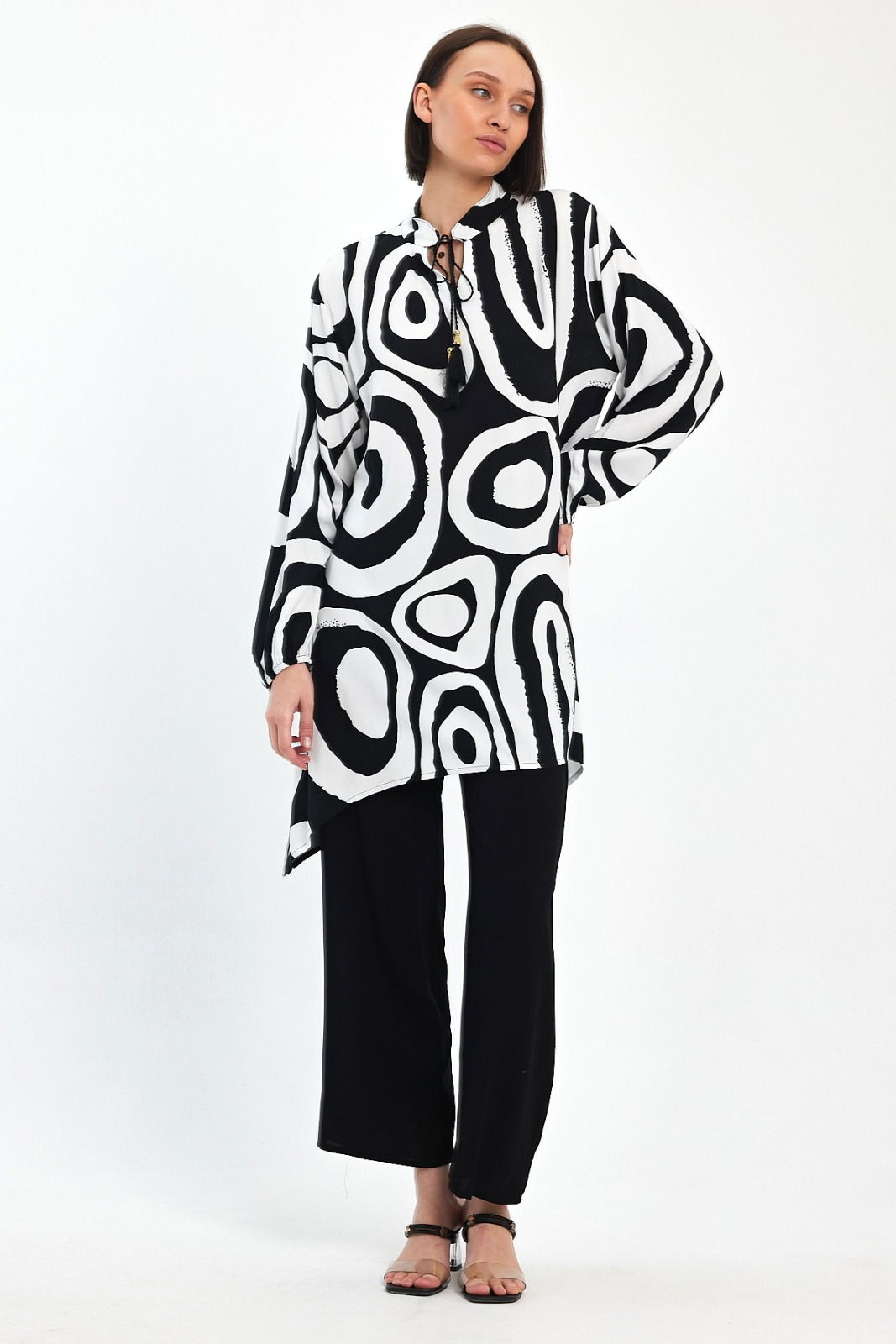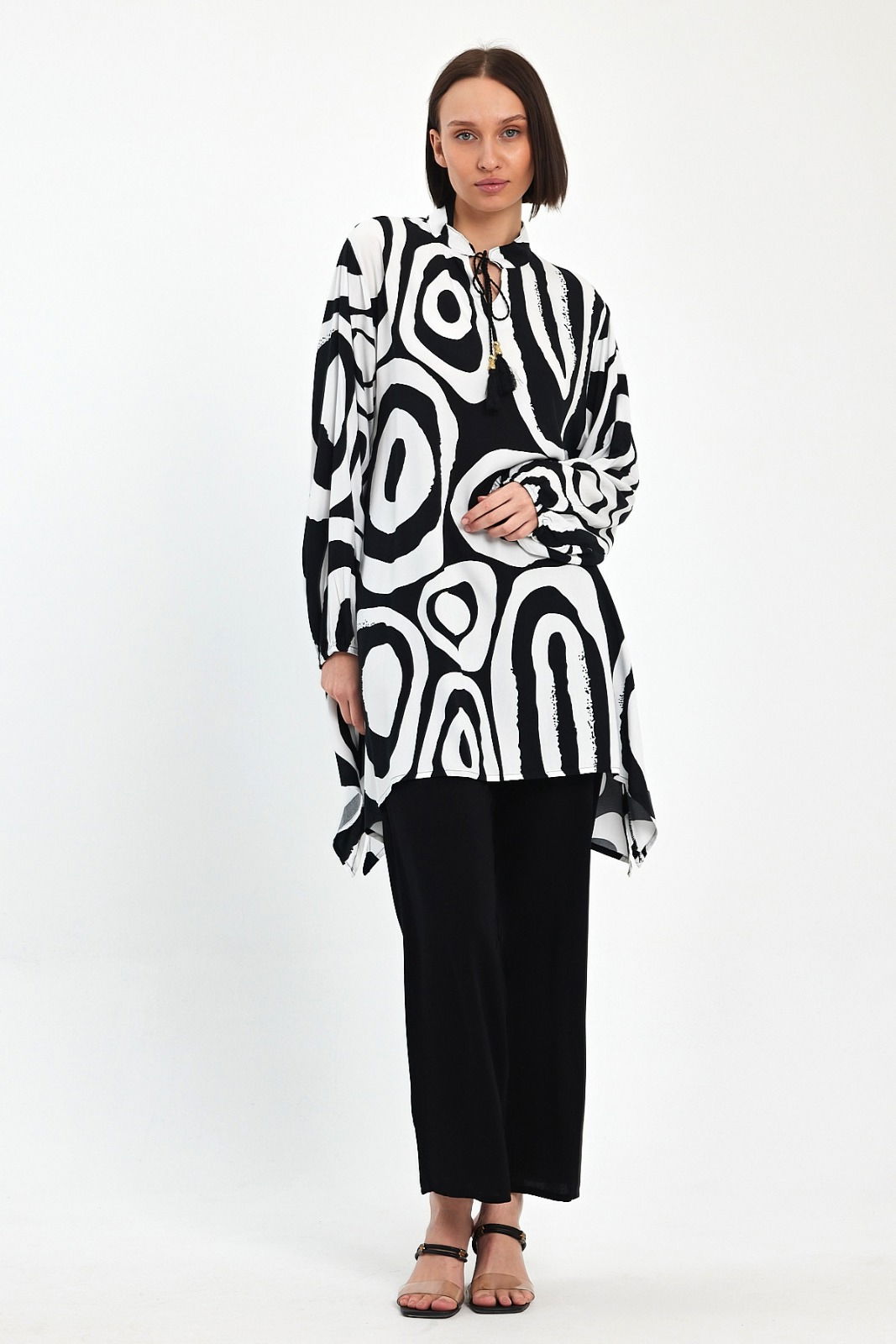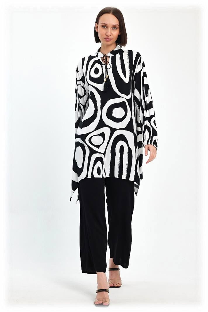 Compleu cu bluza lunga tip tunica si pantaloni, negru cu alb