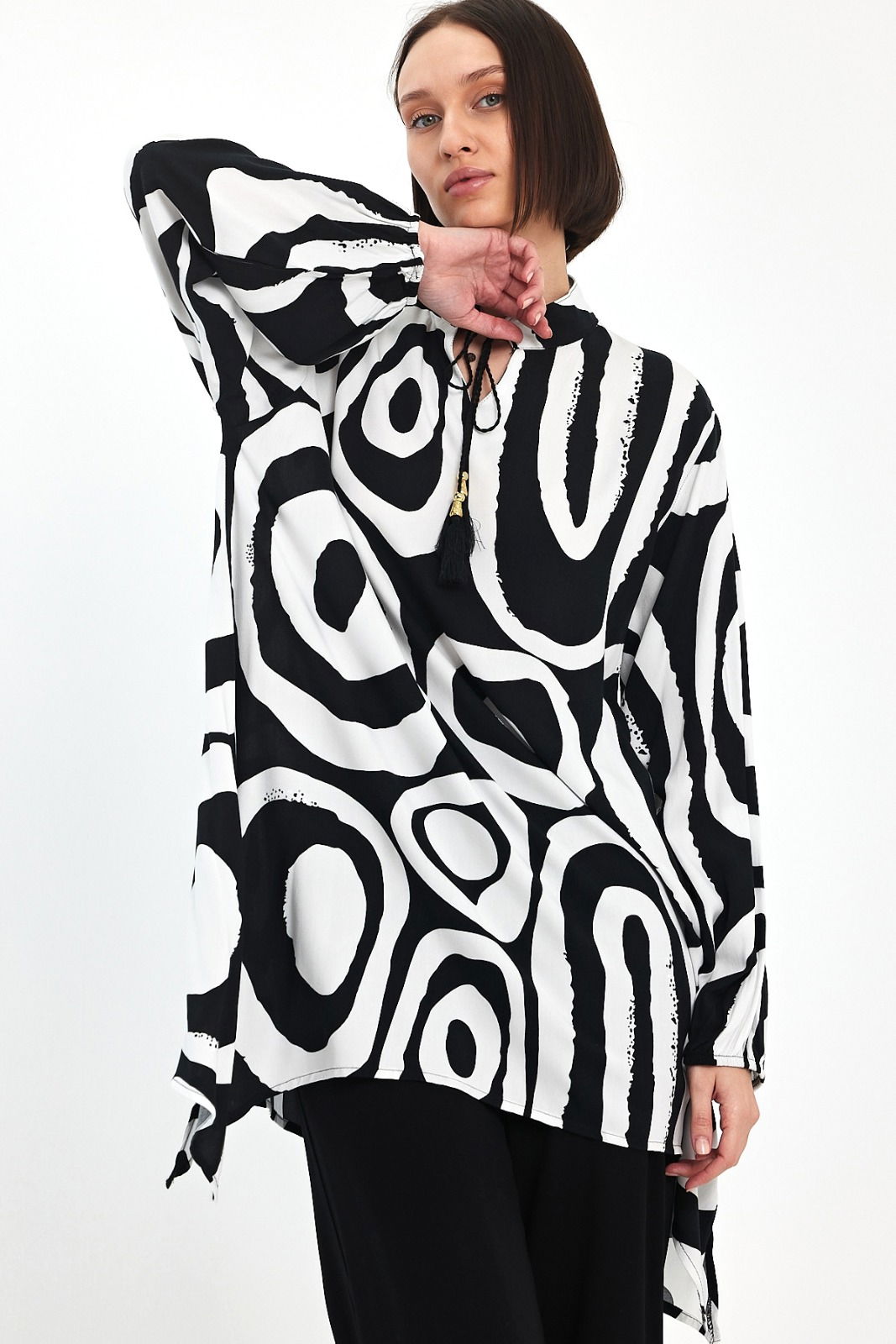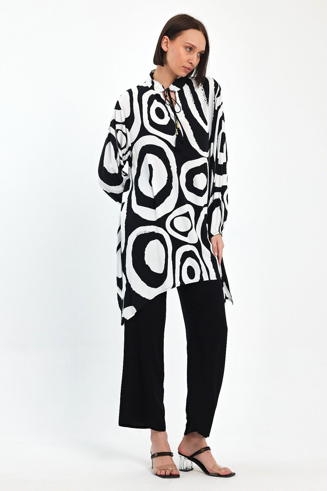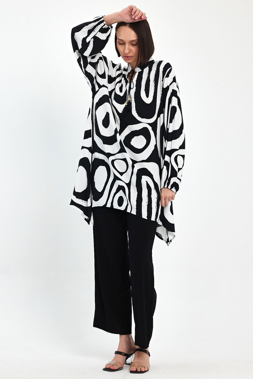 Compleu cu bluza lunga tip tunica si pantaloni, negru cu alb