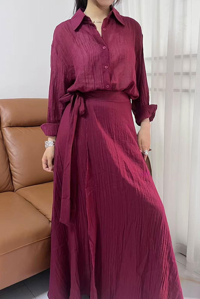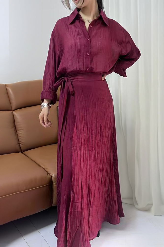 Shopika Compleu din vascoza si bumbac, creponate cu camasa si fusta petrecuta, bordo