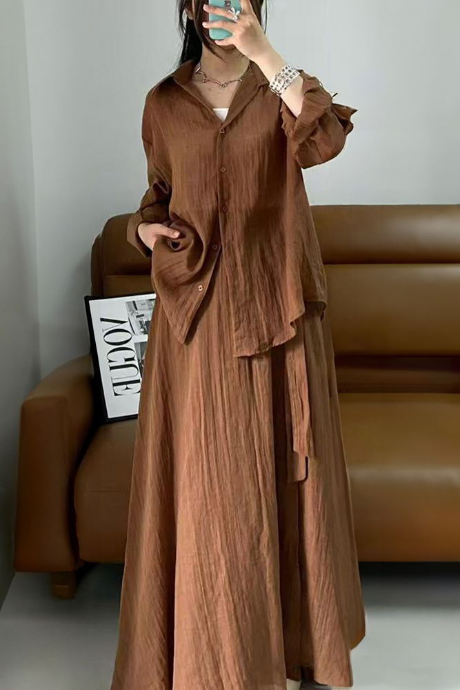 Shopika Compleu din vascoza si bumbac, creponate cu camasa si fusta petrecuta, camel