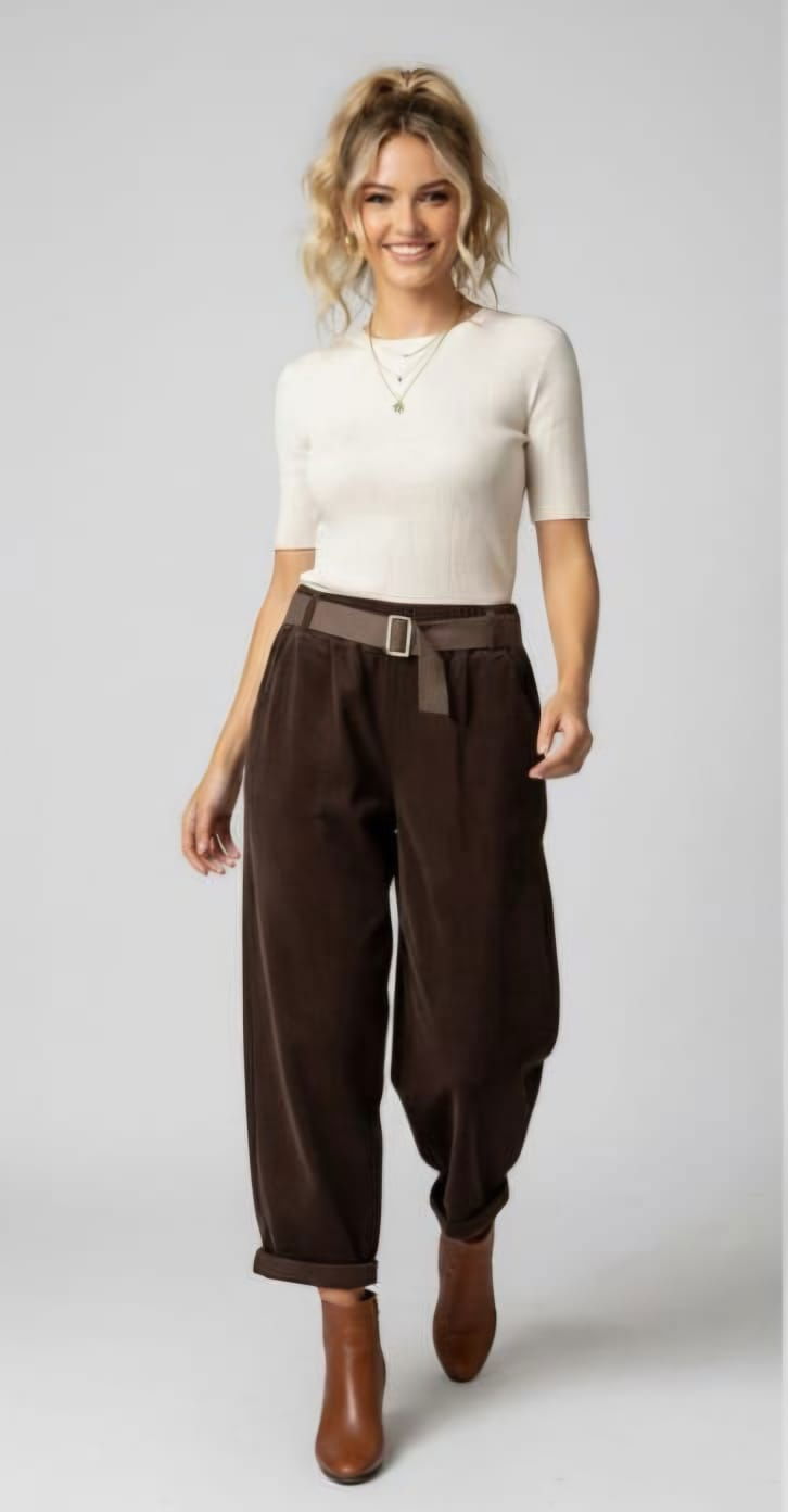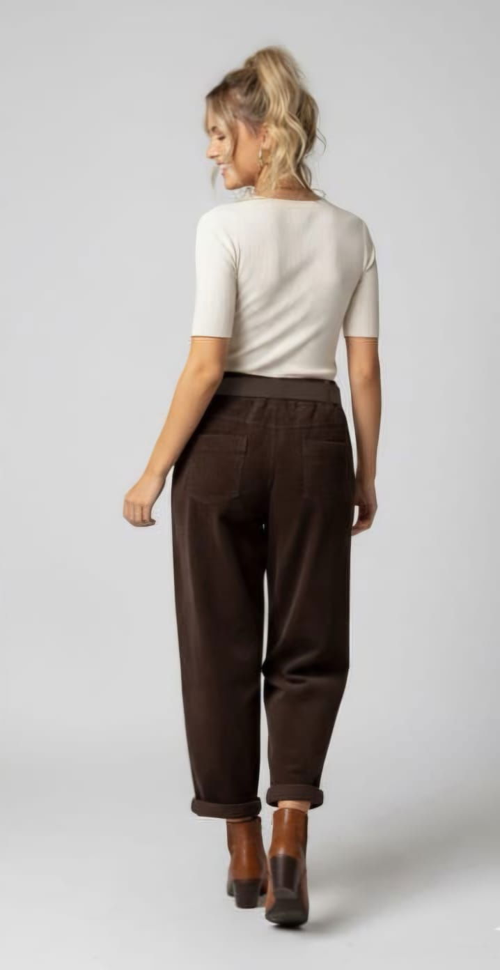Pantaloni confectionati din catifea reiata cu dungi late, un material cald, texturat si extrem de actual. Reia vizibila confera profunzime, iar nuanta bogata pune in valoare materialul si il face usor de integrat in tinute de zi sau de weekend. Croiala relaxata si talia cu curea ajustabila contureaza lejer silueta, oferind libertate de miscare si un look casual-chic. Sunt suficient de comozi pentru ziua intreaga, dar si suficient de rafinati pentru combinatii urbane cu botine sau ghete. O piesa statement intr-o garderoba moderna, unde confortul premium se imbina cu stilul autentic.
