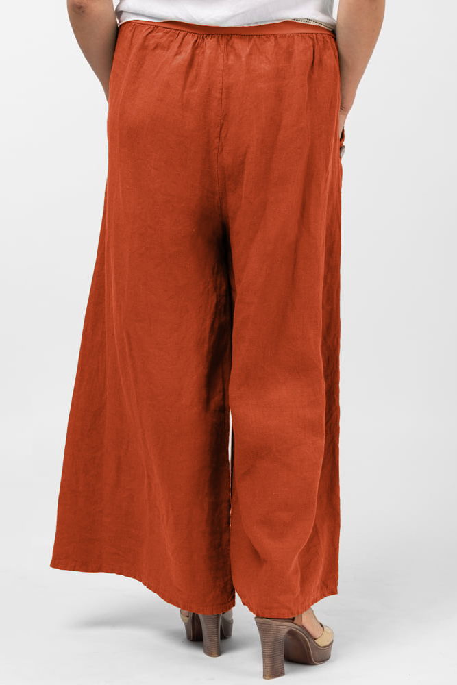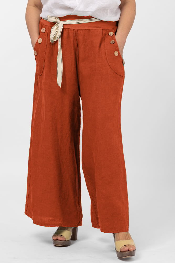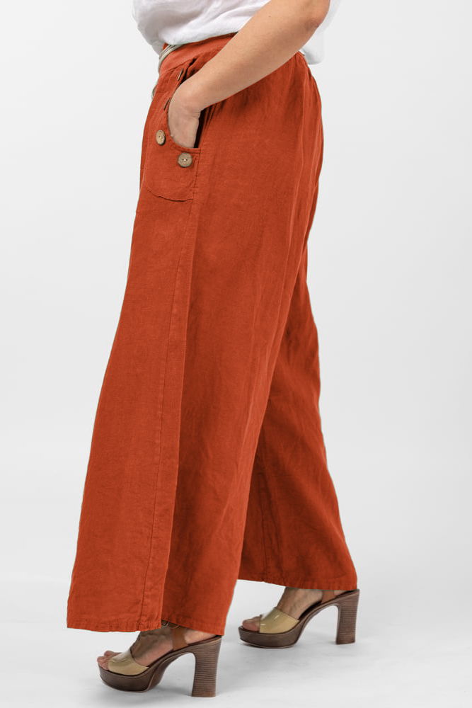 Shopika Pantaloni largi de vara, din in, cu nasturi din lemn la buzunare, caramiziu