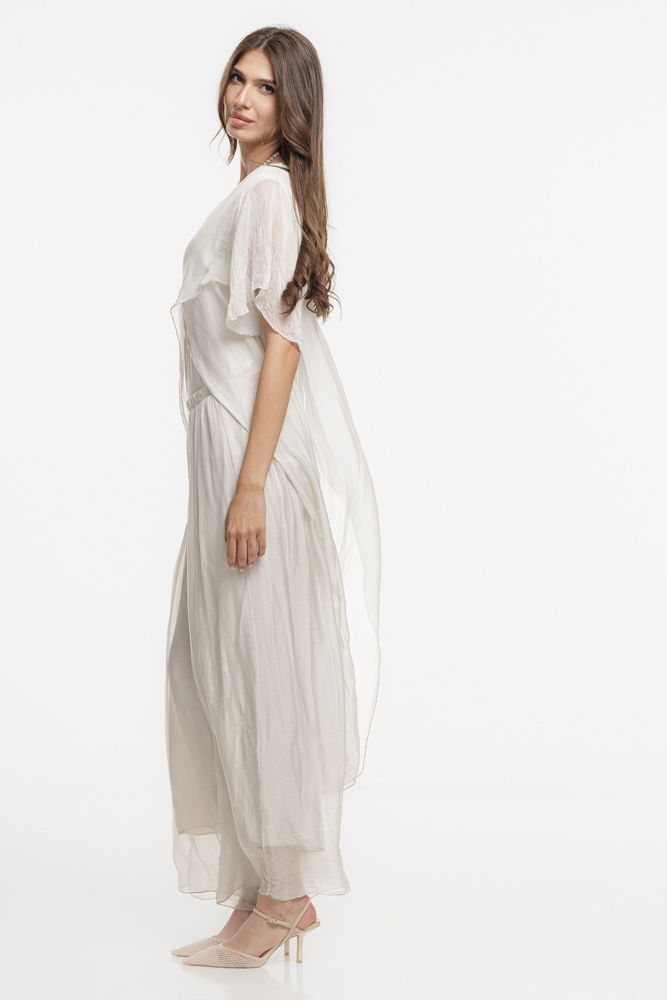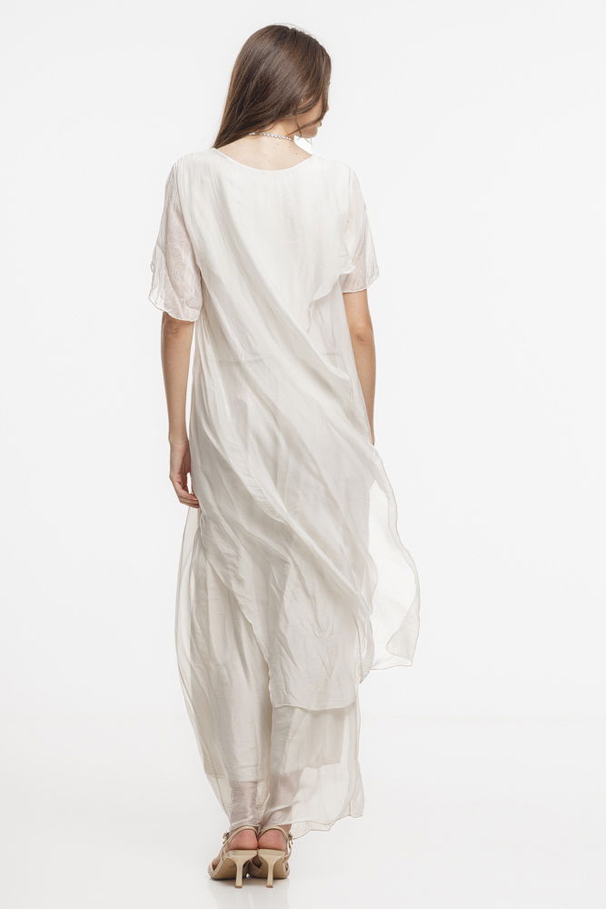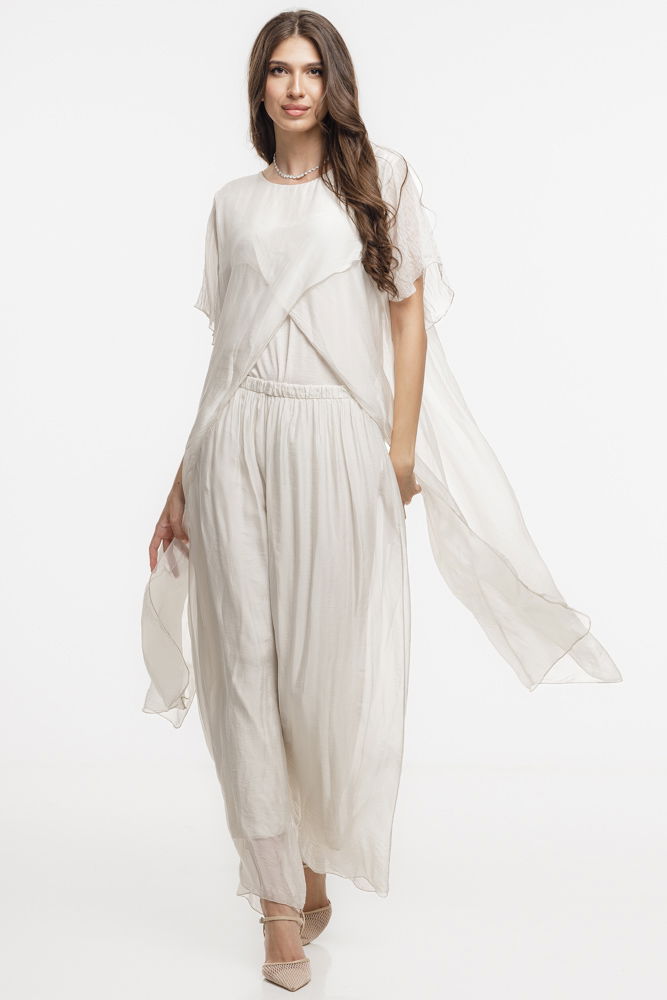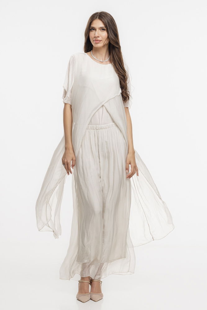 Compleu rafinat din matase naturala, compus din bluza lunga cu croiala fluida si pantalon lejer. Materialul delicat si translucid confera tinutei o eleganta diafana si un confort deosebit. Bluza are maneci scurte si suprapuneri asimetrice care se misca lejer la fiecare pas, iar pantalonul are talie elastica pentru un plus de libertate. Ideal pentru ocazii speciale, evenimente estivale sau tinute sofisticate de zi.