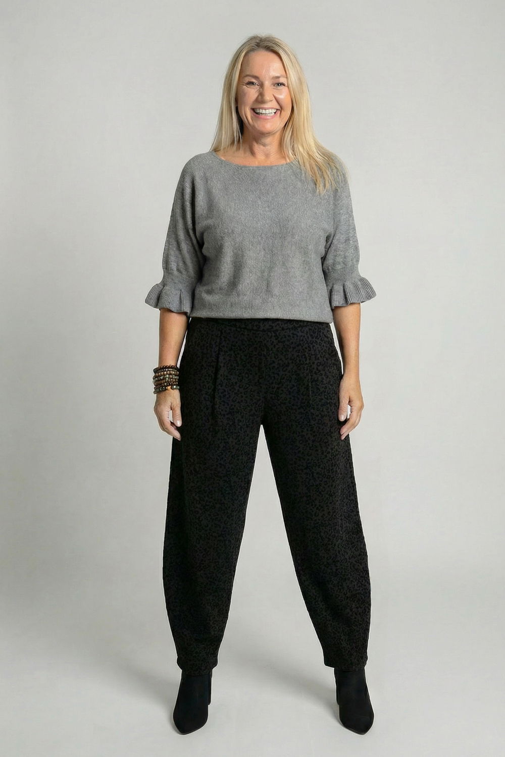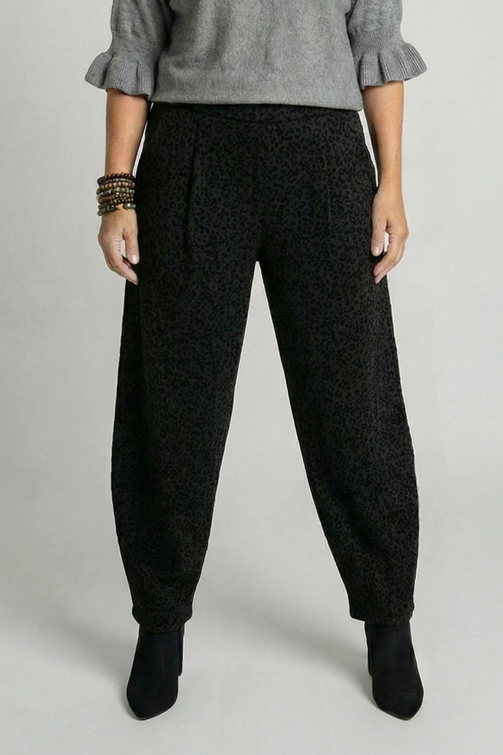 Shopika Pantaloni negri lejeri cu imprimeu subtil emosat animal print – croi relaxat, talie confortabila