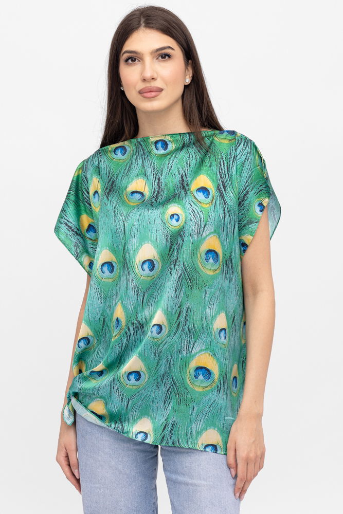 Bluza de vara tip poncho din matase cu imprimeu coada de paun