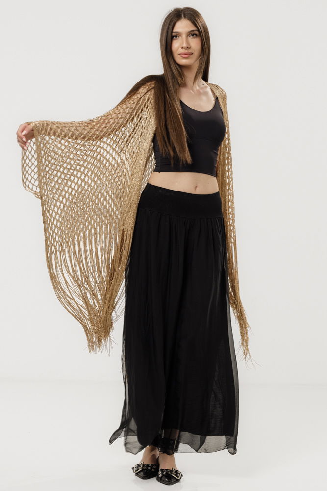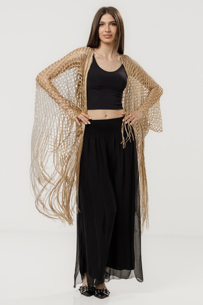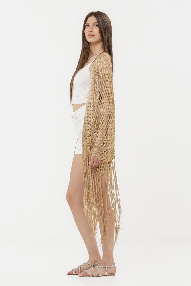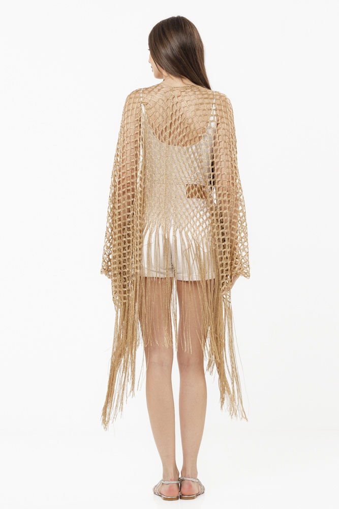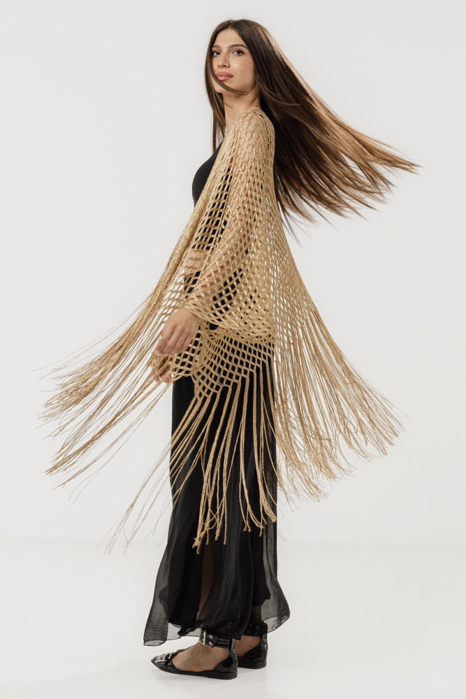 Shopika Poncho bej din plasa cu fir argintiu si franjuri lungi