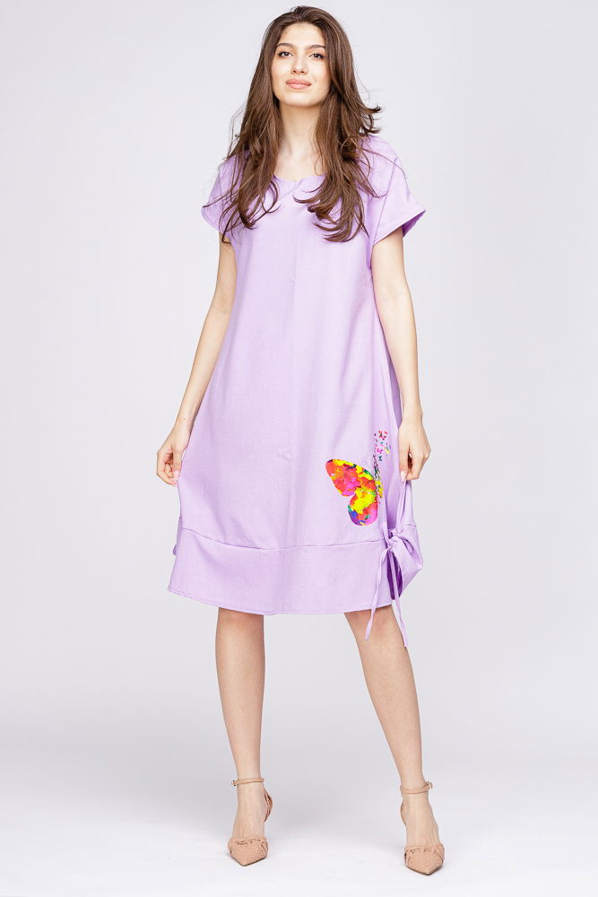 Pierino Rochie `A line` din in mercerizat, mov deschis, cu sireturi laterale si imprimeu fluture stilizat