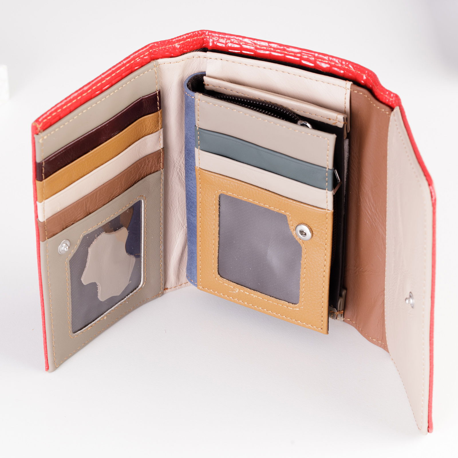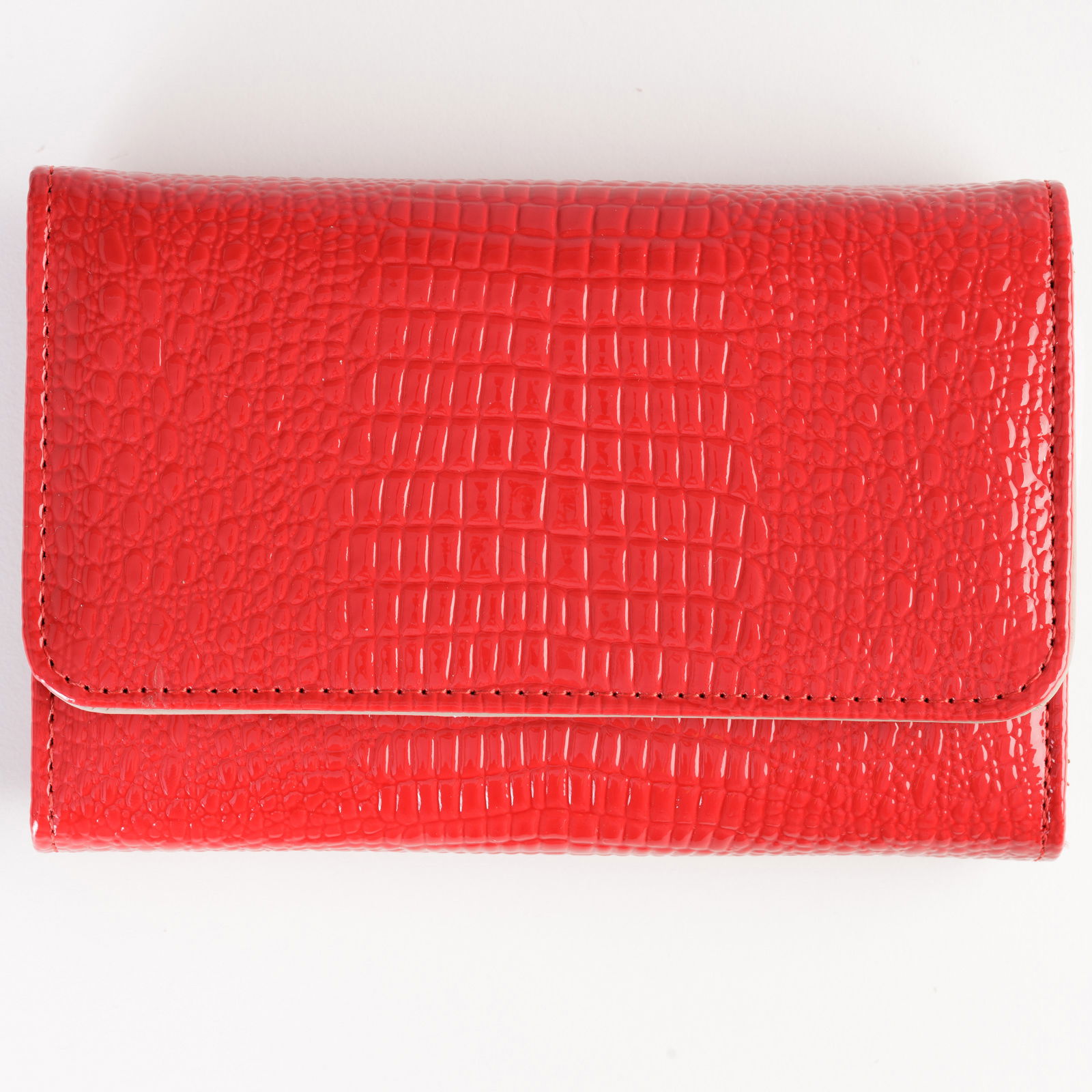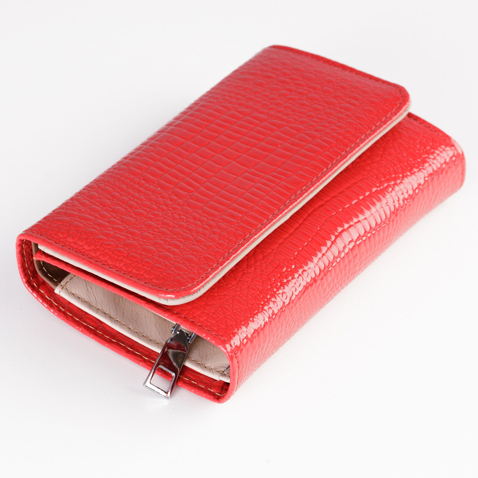 Portofel din piele naturala lucioasa, cu aspect piele de sarpe si capse interioare, rosu
